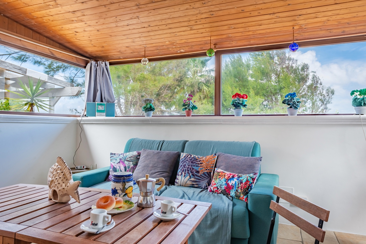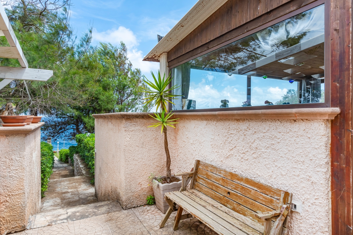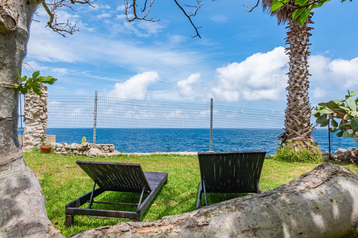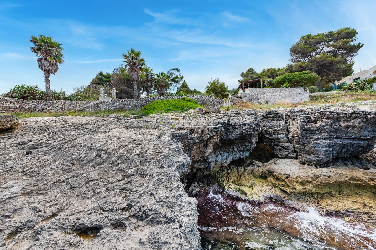 This detached seaside home in Salento features private access to the rocky beach through a gated entrance. Enter through a driveway that takes you to the property via a flight of steps. Through the entrance gate, you are welcomed into a private garden.