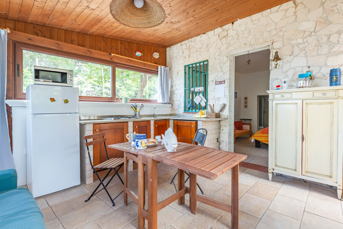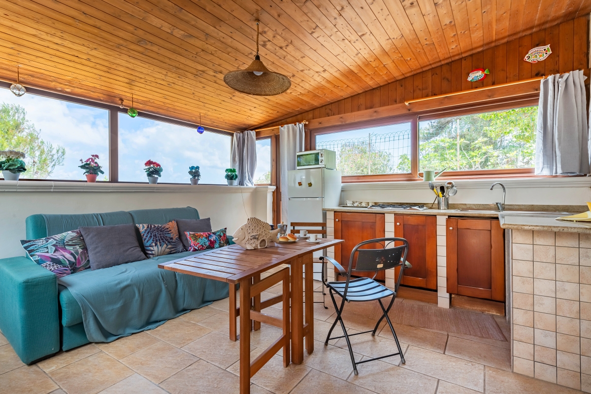 Next to the outdoor dining area, a veranda leads you into the property. As you step in you’ll be welcomed into a bright open living area featuring a sofa bed and a fully equipped kitchen with a cooker hob, microwave, coffee machine and fridge.