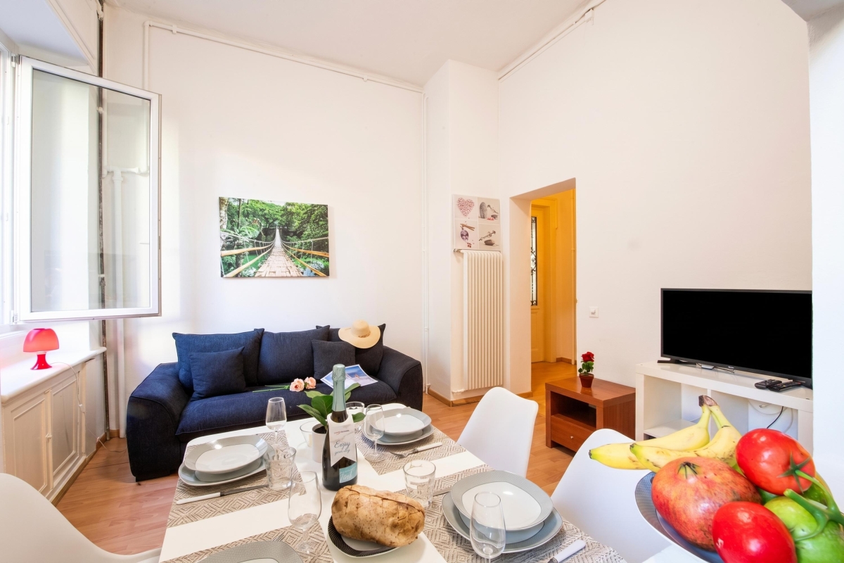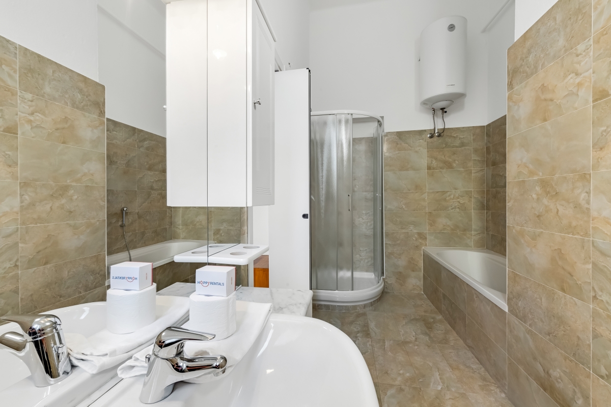 On the ground floor of an elegant residence, the apartment is modern and sleek. It has been thoughtfully equipped with anything a guest might need for their stay. The living/dining room has pale wooden floors and contemporary furniture including a sofa, flat-screen TV and dining table. The separate kitchen is linked to the dining area by a convenient hatch, making serving meals a breeze. The kitchen has a cooker hob, oven, microwave, fridge/freezer and a coffee machine.