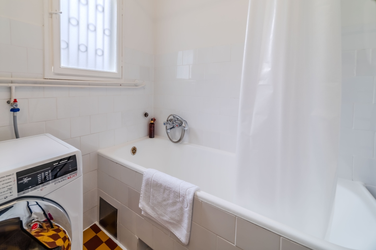 The light-filled apartment is arranged around a central hallway, with all the rooms leading off this. The open kitchen/diner is furnished with a table for 5 and the well-equipped kitchen is fitted with a cooker hob, oven, coffee machine and fridge/freezer.