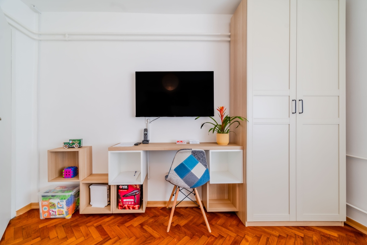 Bedroom 1: The large master bedroom is furnished with a double bed, a single bed, a wardrobe, a small sofa, a flat-screen TV and a desk.