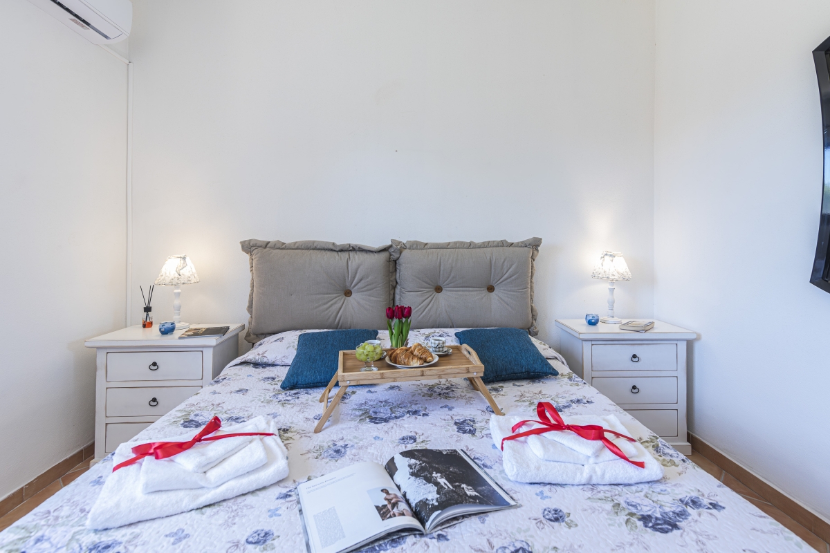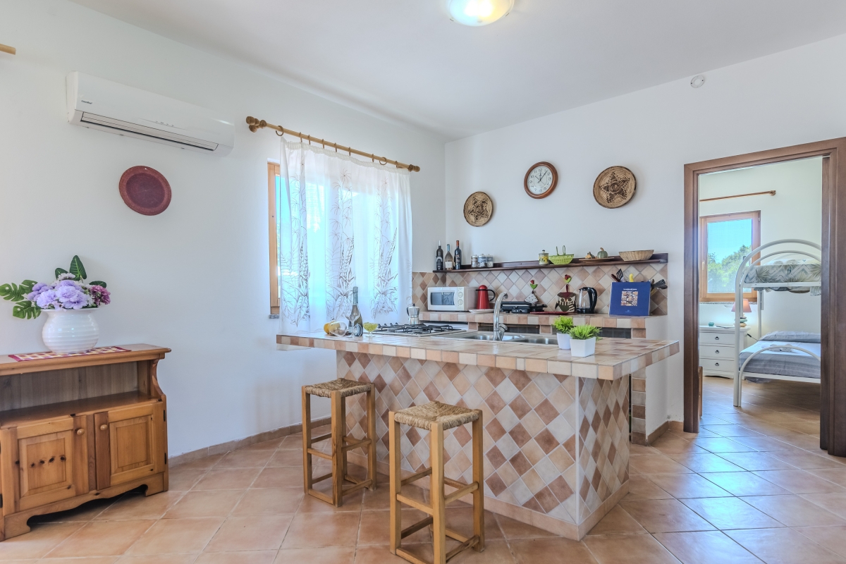 With a large garden and private swimming pool, this villa is the perfect holiday spot for families or friends who want some peace but do not want to be too far from the action. The fully air-conditioned, single-level villa sleeps 6 people in comfort, with the perfect summer combination of stylish indoor and outdoor living that makes it irresistible. The open-plan ground floor consists of an airy seating area with 2 sofas and a flat-screen TV, plus a dining table and a spacious kitchen. The fitted kitchenette is well-equipped with an oven, microwave, Moka coffee machine, and a fridge/freezer. There is also a breakfast bar for quick snacks.