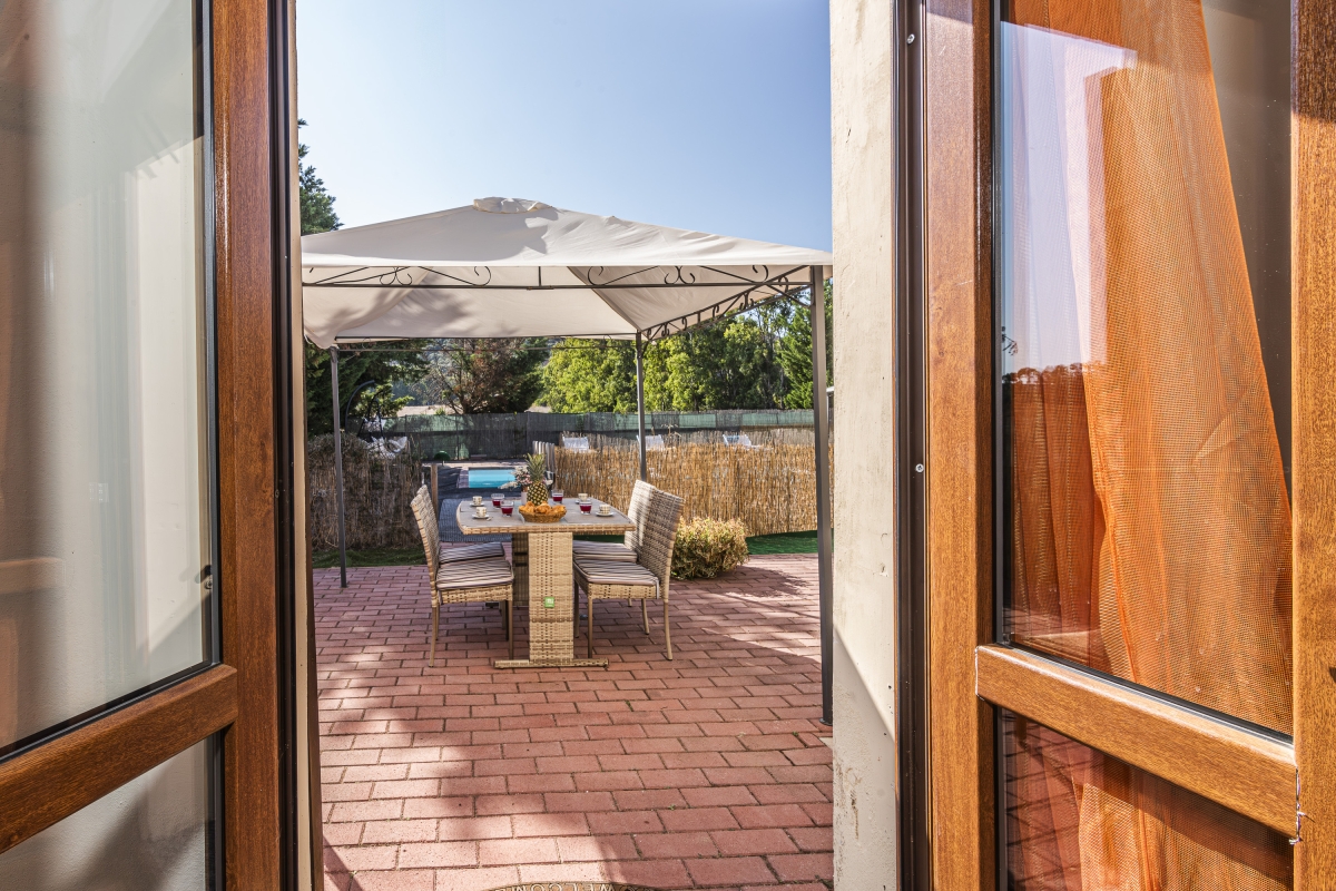 Large glass doors lead out onto a shaded veranda where guests can dine al fresco and enjoy BBQ delicacies. The veranda leads to the swimming pool. The sun loungers by the pool allow guests to relax after a refreshing swim. Beyond the pool is another seating area with parasols, which is ideal for sundowners.