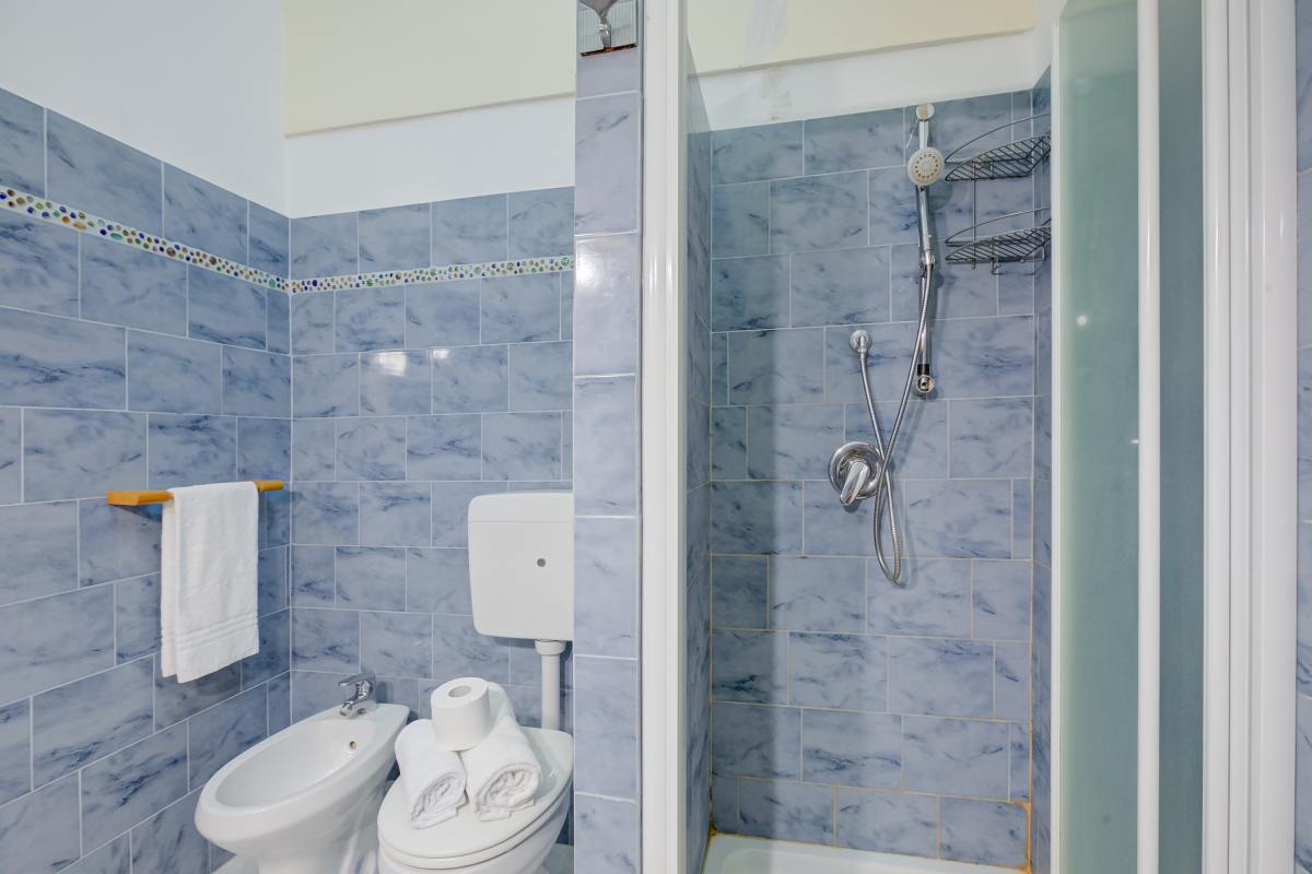 Bathroom 1: A bathroom equipped with a shower, a bidet, a WC and a basin with a mirror.