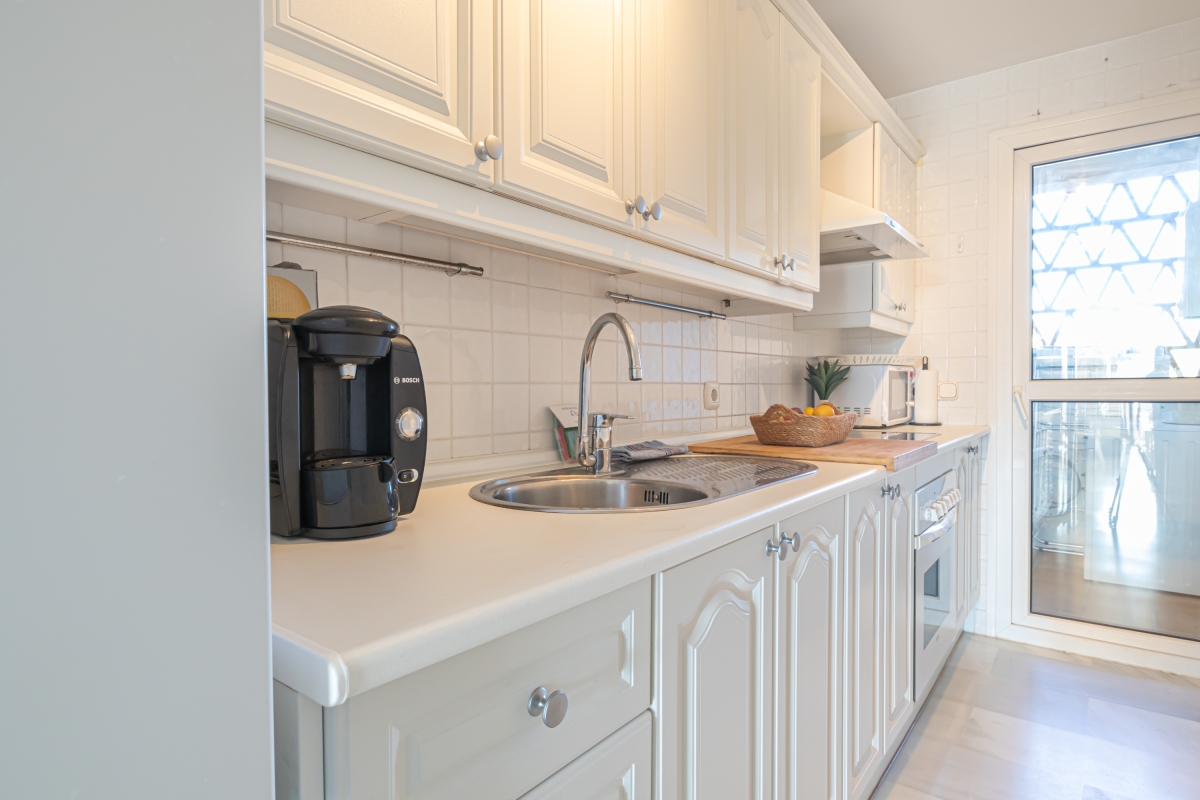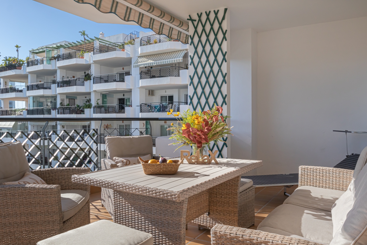 Located in the Mijas Costa, this sea-view apartment is a snug retreat with a living room featuring a sofa, smart TV and a dining area. The spacious terrace is a standout feature, furnished with outdoor seating that offers stunning views of the lush green surroundings and the spectacular sea. The master bedroom features an attached terrace and an ensuite bathroom while the second bedroom has two single beds. A fully equipped kitchen completes this apartment with an induction hob, coffee machine, and microwave.