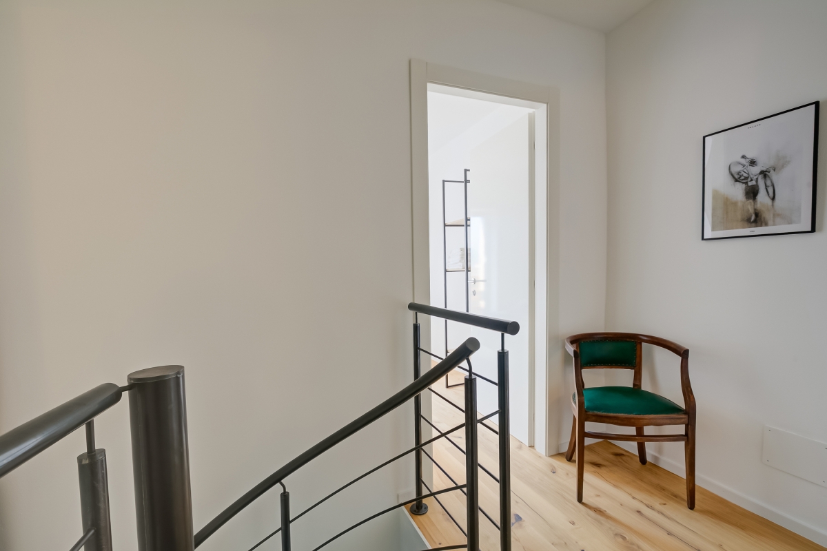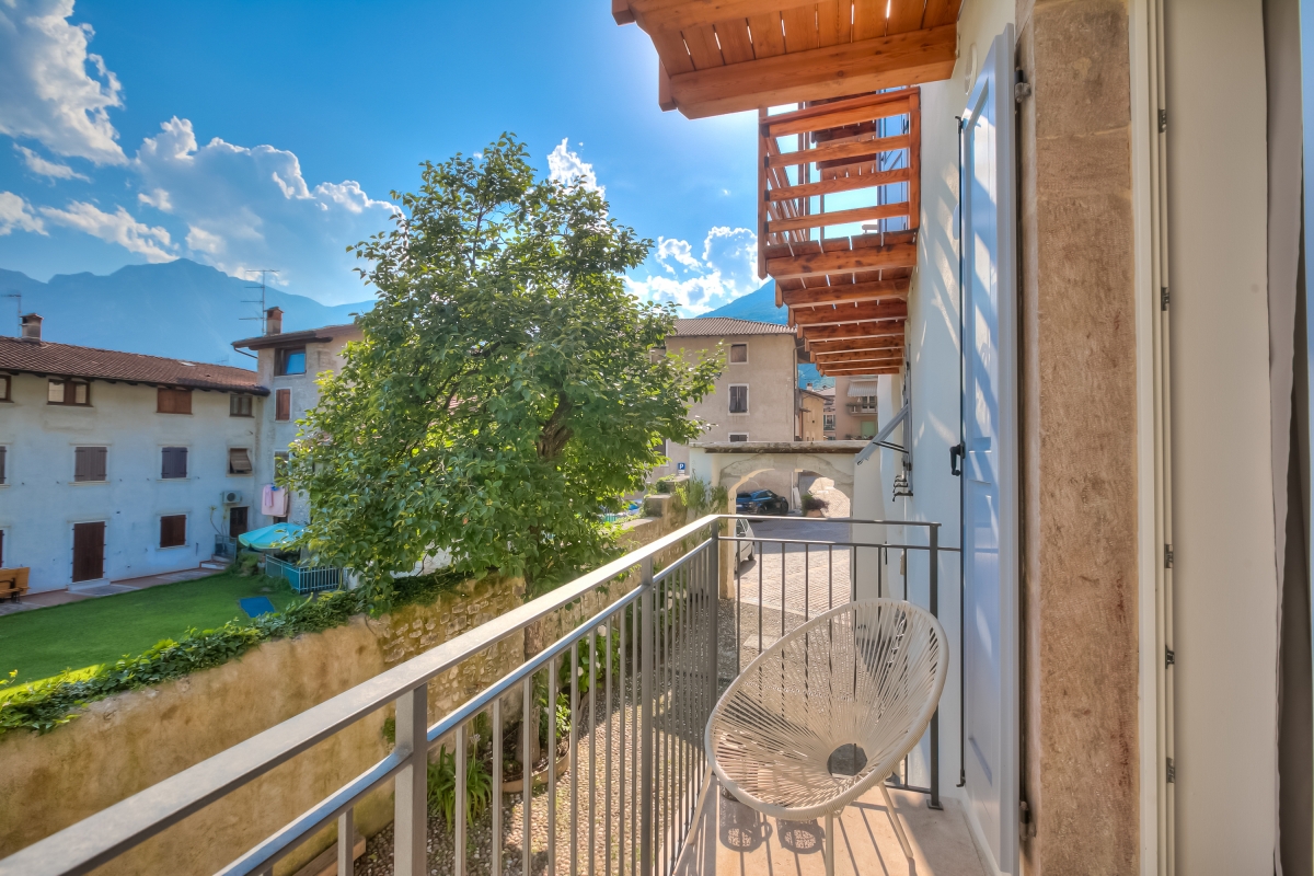 The property is arranged over the ground and first floors of a historic building in the medieval town of Arco. On the ground floor, the open-plan living space features a characterful vaulted ceiling and is furnished with a comfortable sofa bed, a flatscreen smart HDTV and a dining table. This area also incorporates the kitchen which is fully equipped kitchen with; a cooker hob, an oven, a coffee machine, microwave, toaster and a fridge freezer. From the master bedroom on the first floor, guests can access the balcony and enjoy alfresco dining. This floor is reached via a spiral staircase in the living room.