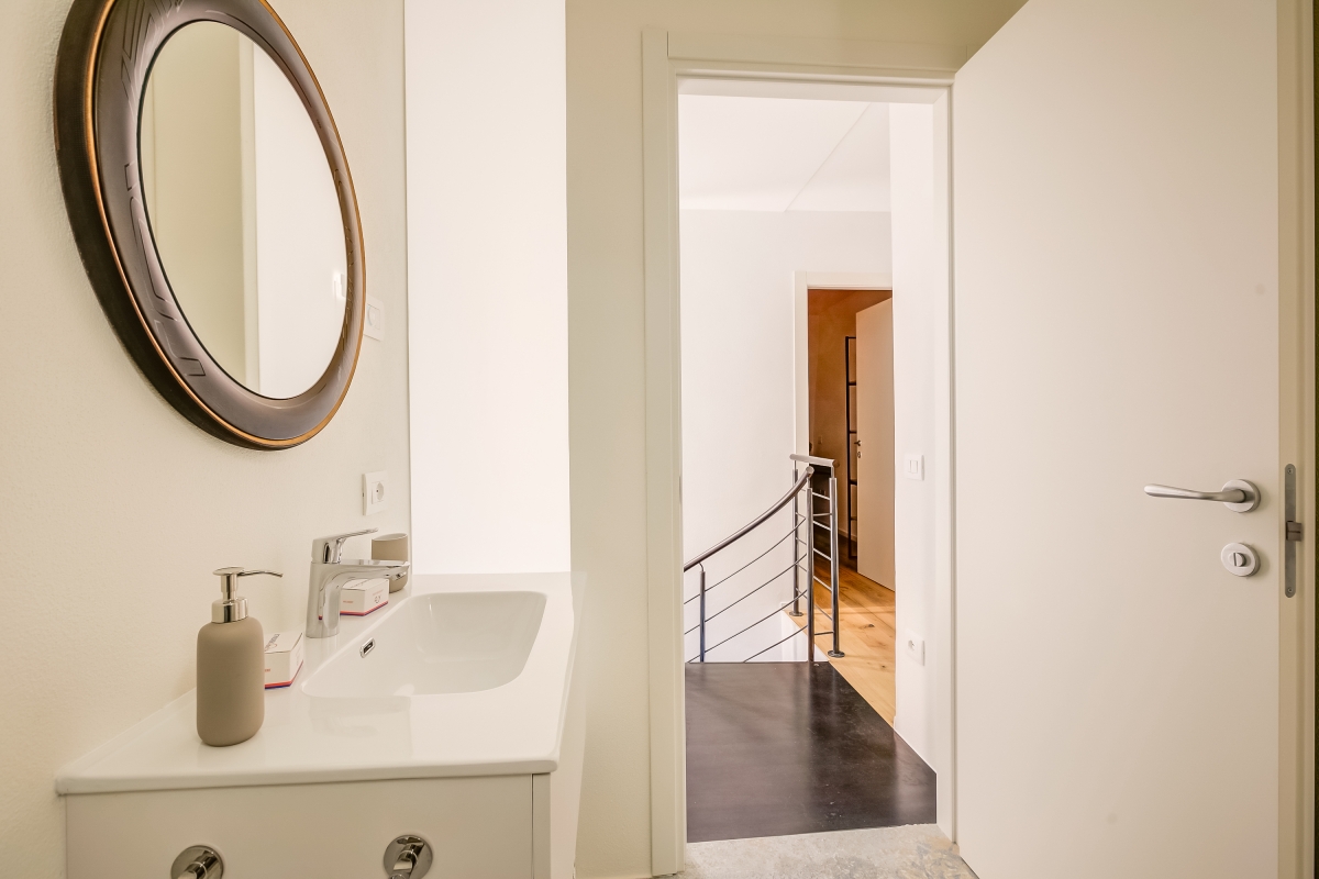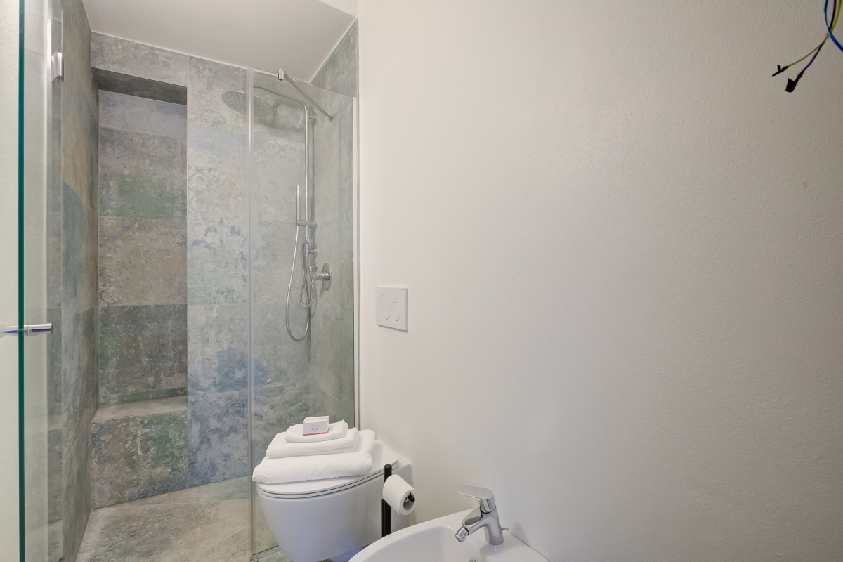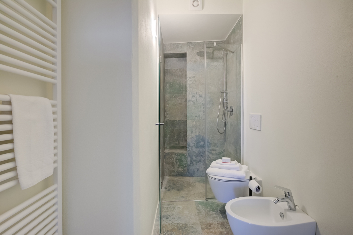 The modern bathroom is fitted with a shower in the bath, a shower, a bidet, a washbasin and a WC