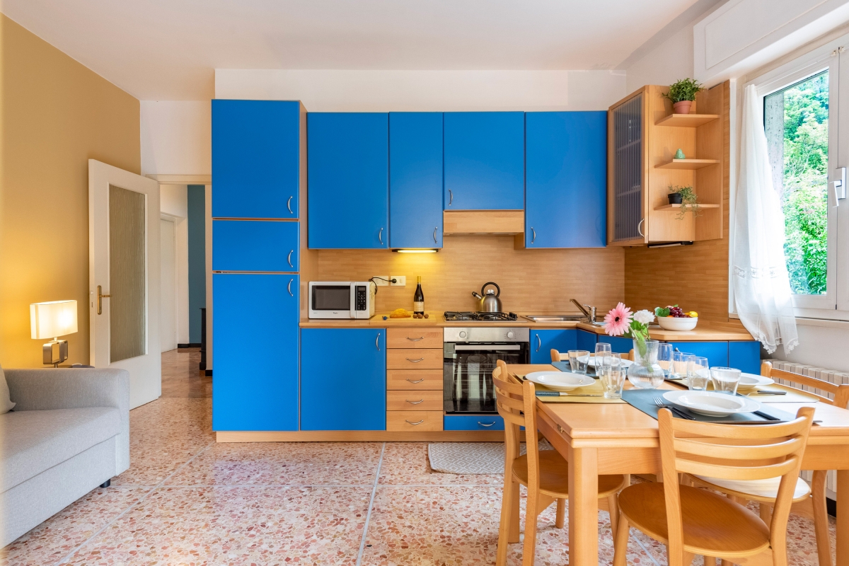 Just 2-minutes from the coast, the apartment’s decor is stylish and modern. The open-plan living space is on the corner of the building so full of light, thanks to double-aspect windows. Glass doors open onto a small balcony with a small table and chairs where guests can enjoy the lush surroundings. Inside, there is a sofa, flat-screen TV and a pine dining table for 4. Next to this is a vibrant blue fitted kitchen. The kitchen is equipped with a cooker hob, oven, microwave and a fridge/freezer.