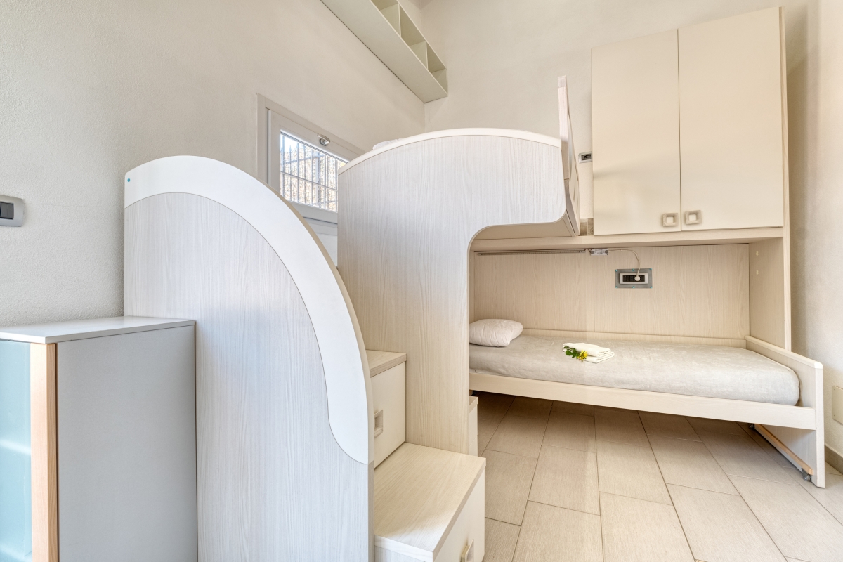 * Bedroom 2 (Third floor):** Furnished with a bunk bed and a practical wardrobe, ideal for families or groups of friends.