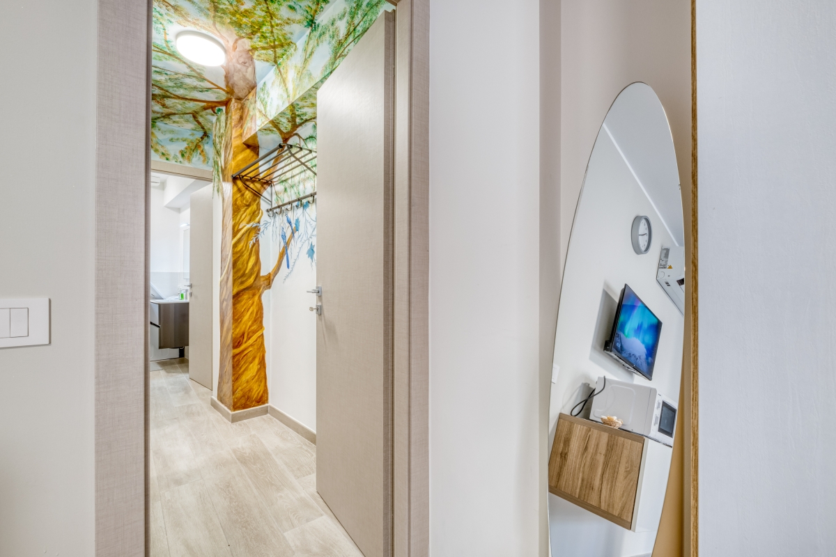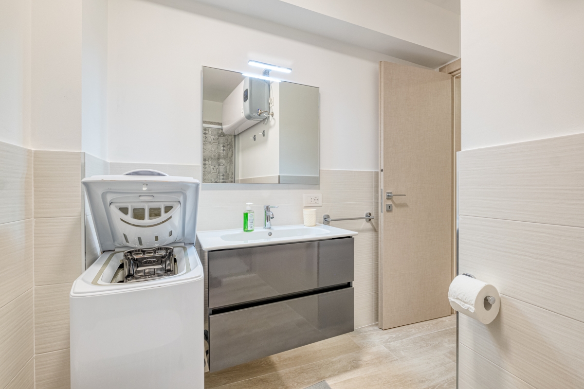 Located between Albenga and Pietra Ligure, this modern apartment is in the peaceful coastal town of Ceriale. A one-bedroom apartment on the ground floor, it is ideal for a group of 6 and promises a serene getaway on the Italian Riviera. The apartment is decorated with artistically painted walls in the corridor, adding a unique touch of elegance. An open-plan living area bathed in natural light welcomes you with its airy ambiance and is furnished with a sofa, a flat-screen TV and a dining table to enjoy shared meals together.