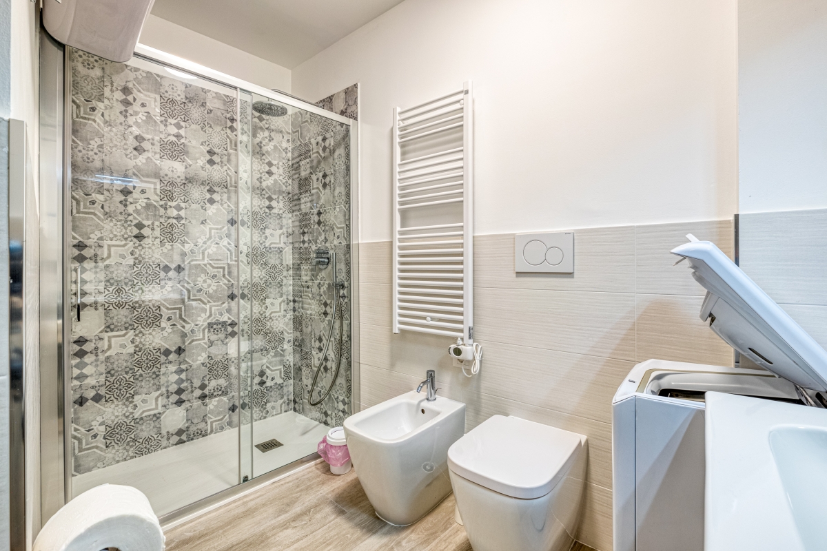 A bathroom equipped with a shower, a bidet, a WC and a basin with a mirror.