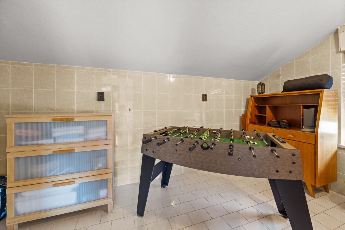 Outside, the private garden with sun loungers and a BBQ invites you to enjoy alfresco meals and leisurely afternoons. For fun and entertainment, games like Foosball and Table Tennis are also provided. Ideal for honeymooners and families alike, this home also includes a laptop-friendly workspace for remote workers, blending rustic charm with modern convenience.