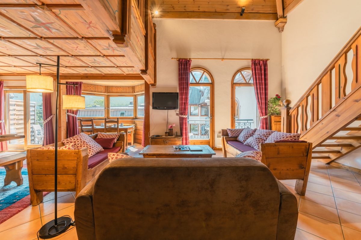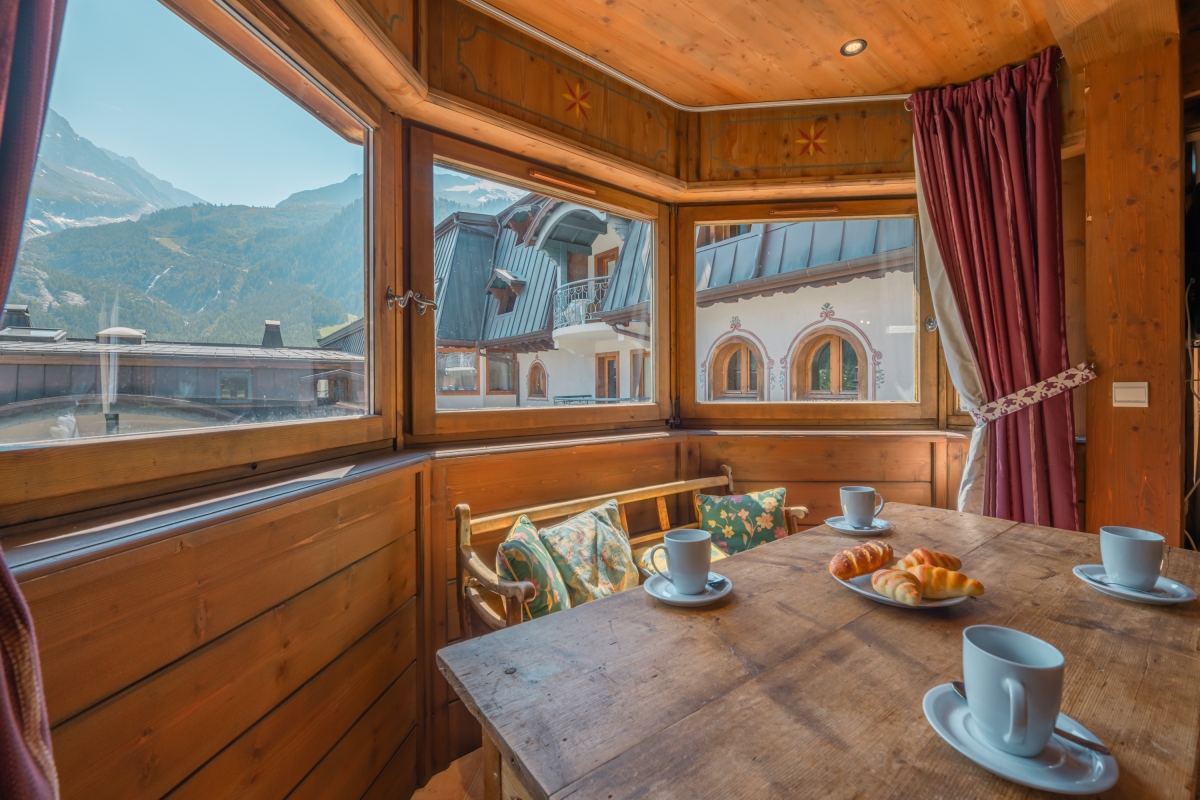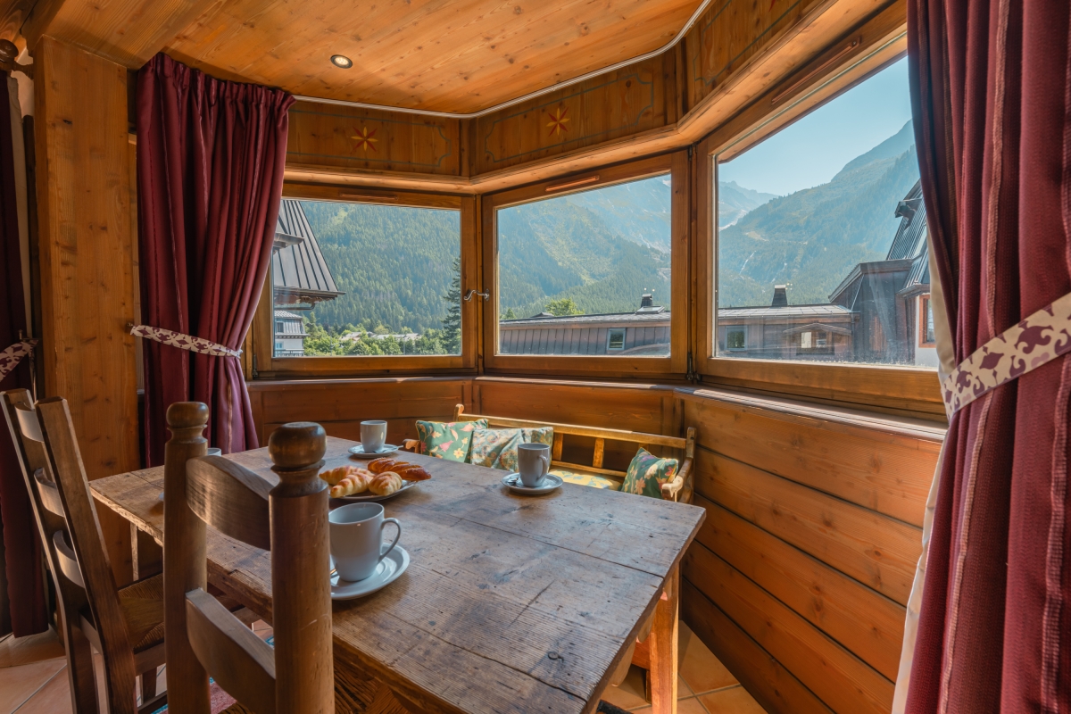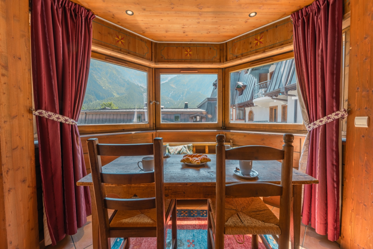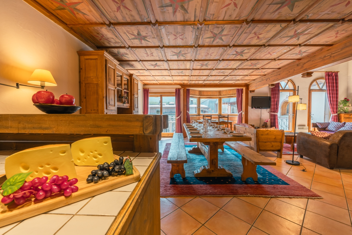The decor is both airy and cosy, with wooden ceilings and large windows. The open-plan living space is spacious with traditional furniture including three sofas, a flat-screen TV and a large dining table with benches. There is a smaller dining table in the bay window, where guests can enjoy the views with their meals. Glass doors open onto the private balcony with panoramic mountain views. The café-style table and chairs on the balcony allow guests to relax with a cup of coffee or glass of wine in the fresh mountain air.
