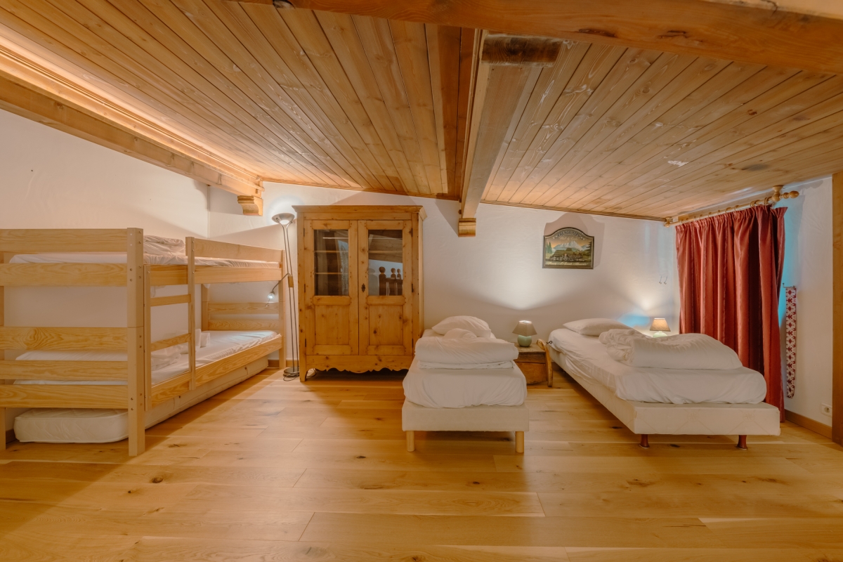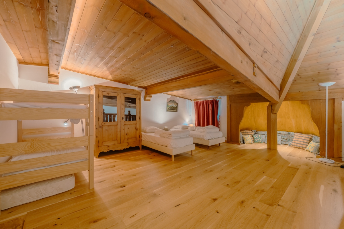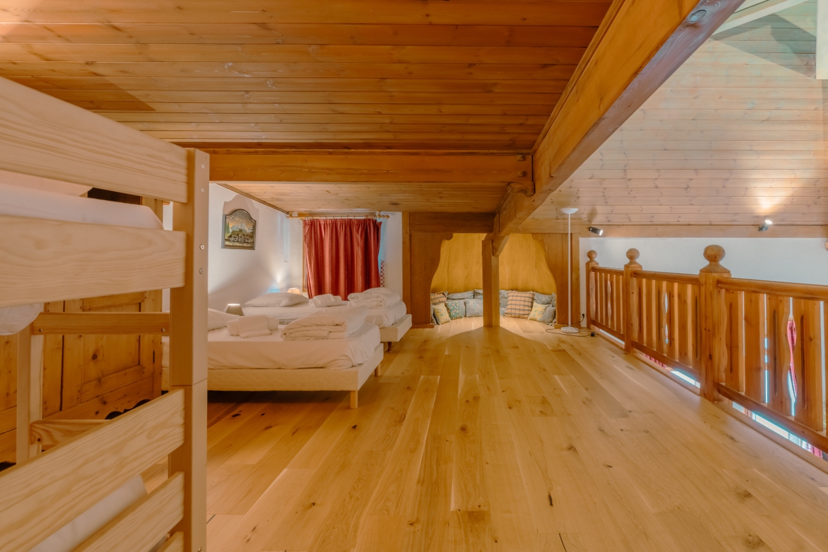 Bedroom 4: On the mezzanine above the main living space this spacious room has two single beds and a bunk bed, a wardrobe as well as a cosy relaxing nook with cushions.