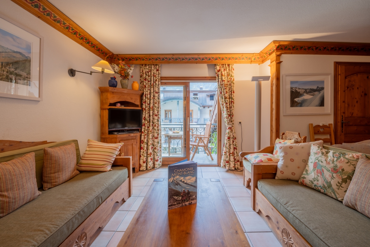 The open-plan living area has alpine touches with wooden furniture, including two sofas, armchairs and a dining table for 6. Glass doors lead out onto a private balcony with lovely mountain views. There is a table and chairs on the balcony, so guests can enjoy a cup of coffee and take in their stunning surroundings.