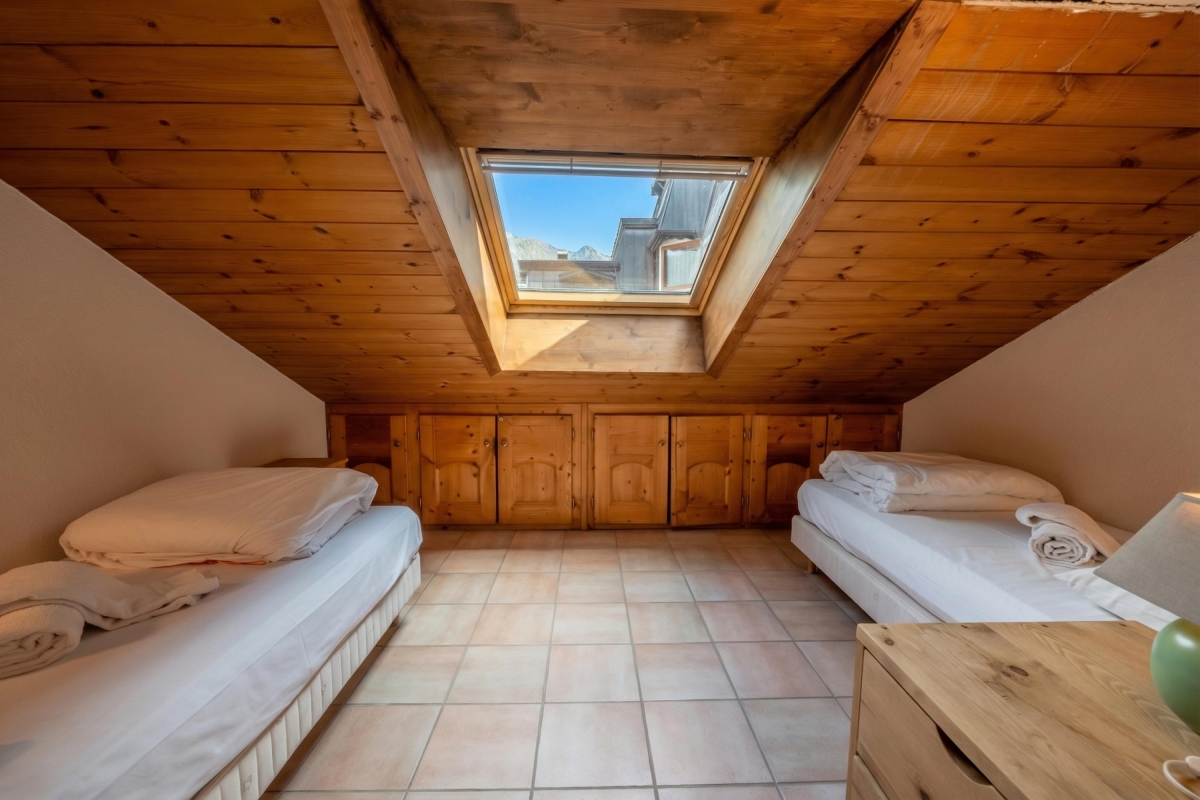 Bedroom 2: Tucked under the wooden eaves, this bedroom has 2 single beds and a wardrobe.
