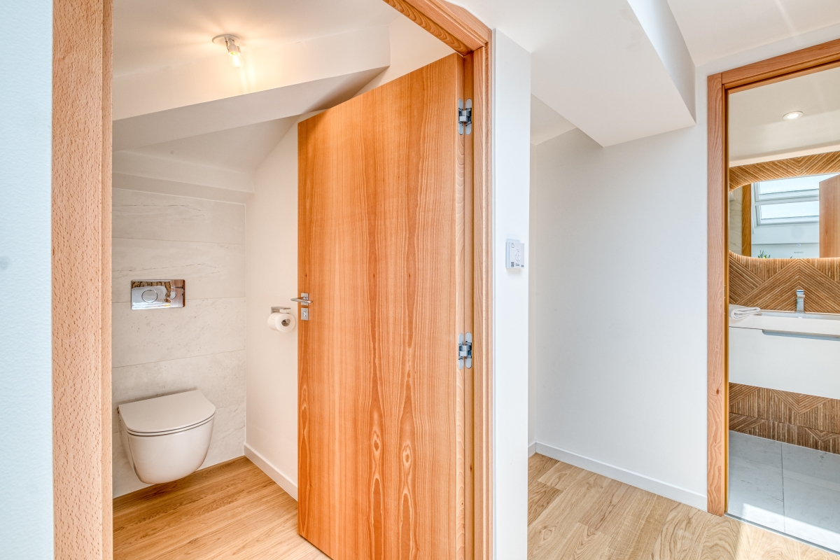 Bedroom 1 : The master bedroom is upstairs, designed as an open duplex without a door, tucked under the eaves with a large skylight. It features a double bed, a wardrobe, and an en suite bathroom, creating a bright and airy atmosphere