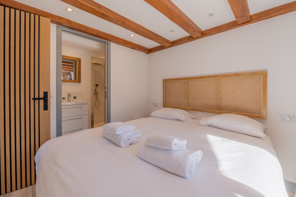 Bedroom 1: The snug master bedroom, lined with wood is furnished with a double bed 160cm x 180cm