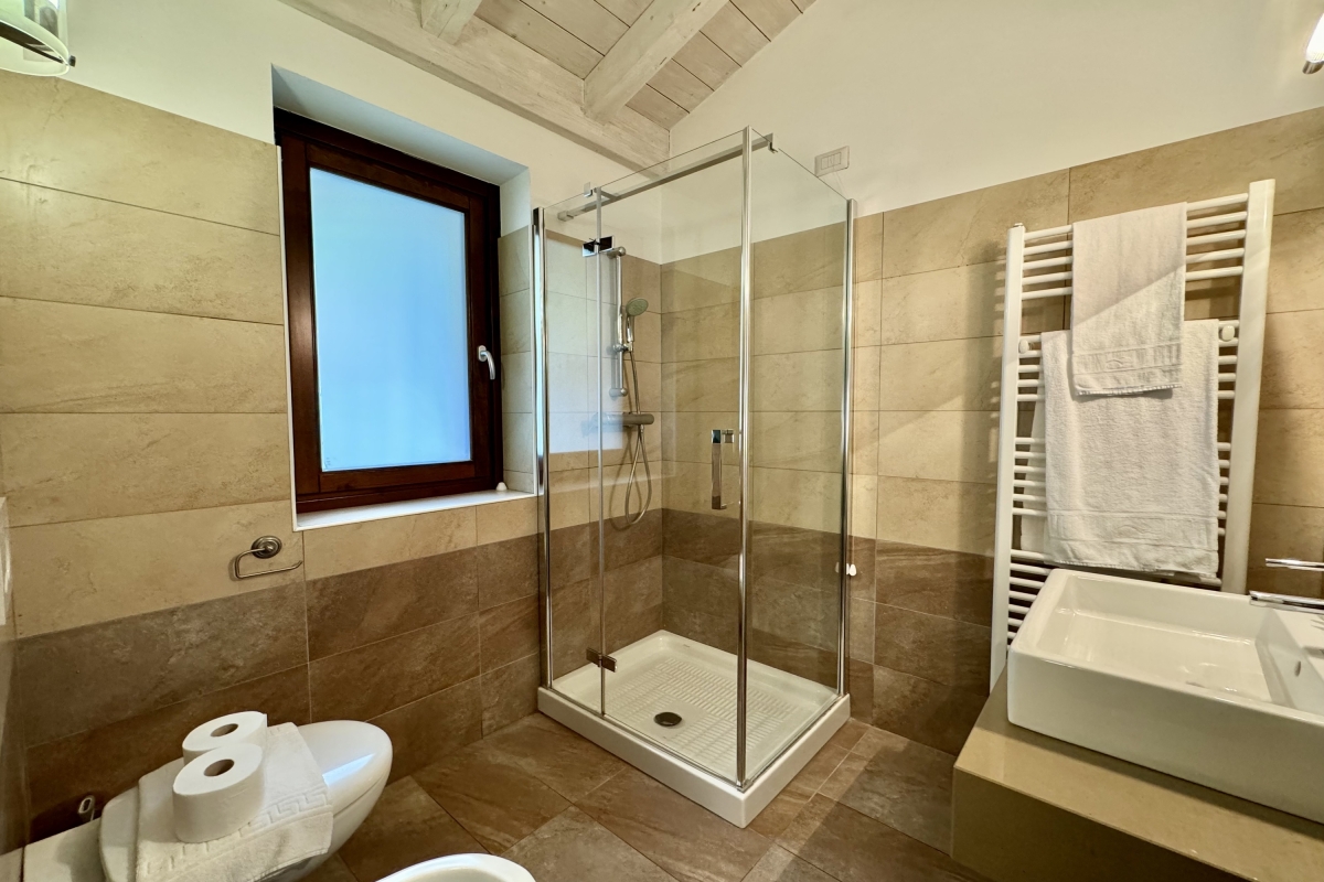 Groups of up to 6 can easily be accommodated to the stylish sleeping arrangements of the beautiful villa. Both double bedrooms boast lake views and offer a serene haven in which to unwind, with a wardrobe and dressing table alongside direct access to a sunny first floor balcony terrace.