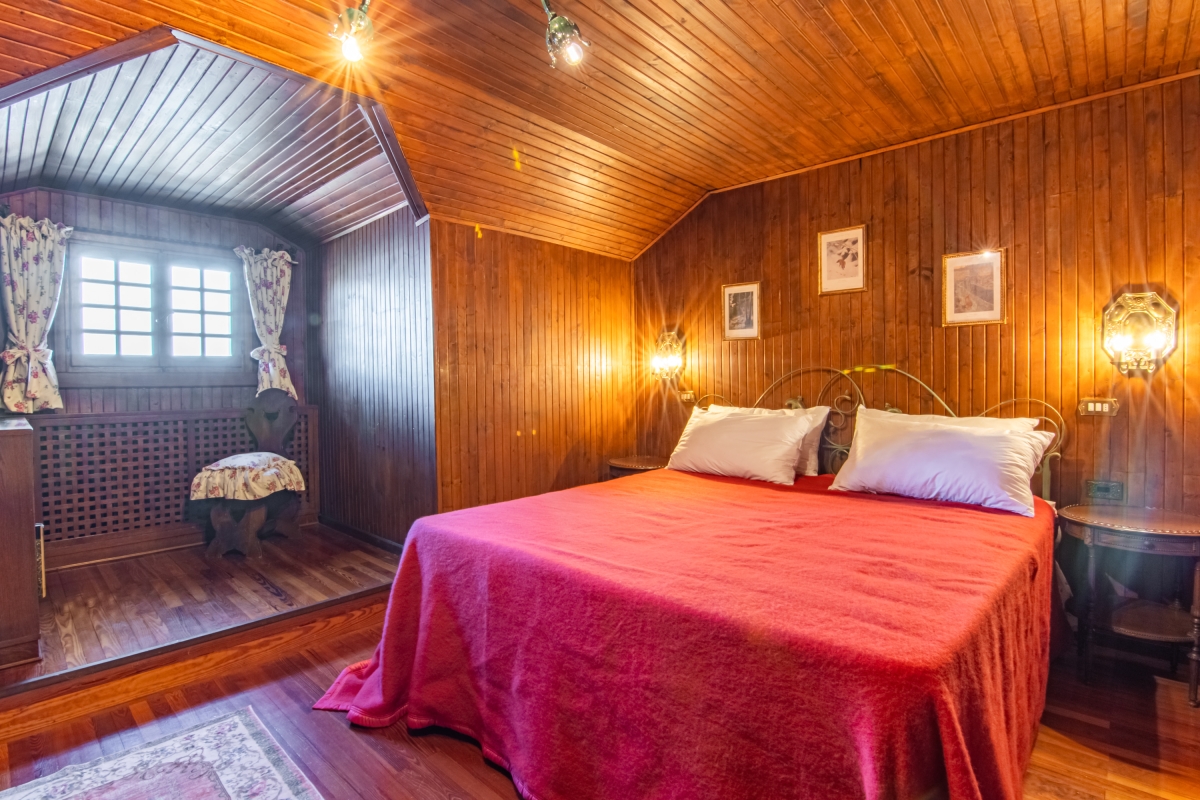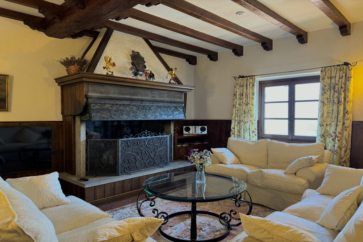 The chalet is built out of stone and wood, with charming interiors featuring wooden floors and beamed ceilings. The cosy living room has 3 sofas and a large, ornamental fireplace. French windows open onto a stone loggia. There is an elegant dining room with a large table which seats 10 people and a separate kitchen, which is very well-equipped with a cooker hob, oven, microwave, dishwasher, American fridge, freezer and a drip coffee machine. There is also a large dining table for more casual meals.