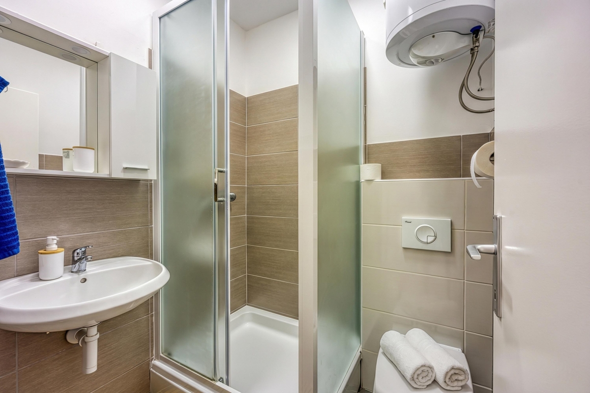 The bathroom is equipped with a shower and WC.