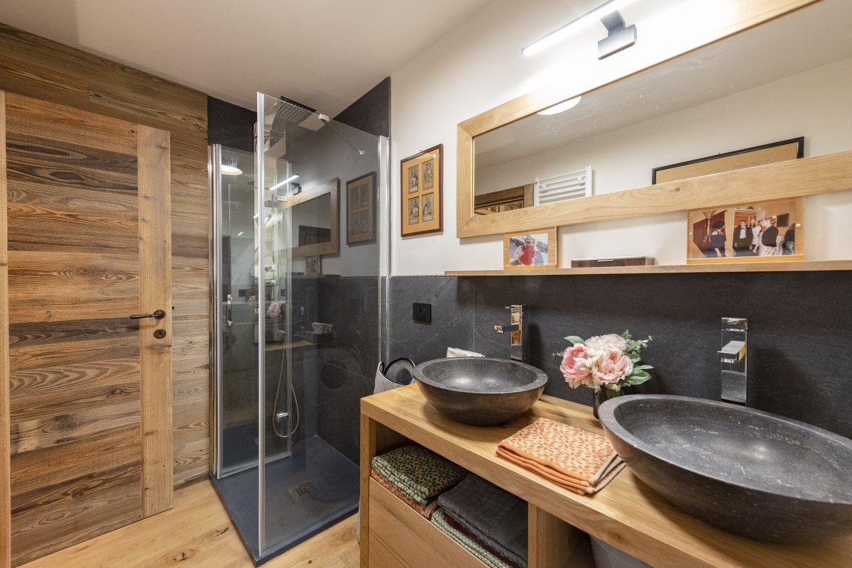 Access to the apartment is via some stone steps which lead down to a small terrace with a café-style table and chairs. The glass front door opens into a stunning living room, lined with stone and wooden paneling. The rich décor includes a sofa, a banquette, a flat-screen TV and bookcases. Towards the other end of the room, there is a wooden dining table for 6 next to a modern fitted kitchen. The kitchen is equipped with an induction hob, microwave, dishwasher, fridge/freezer and mokka coffee machine.