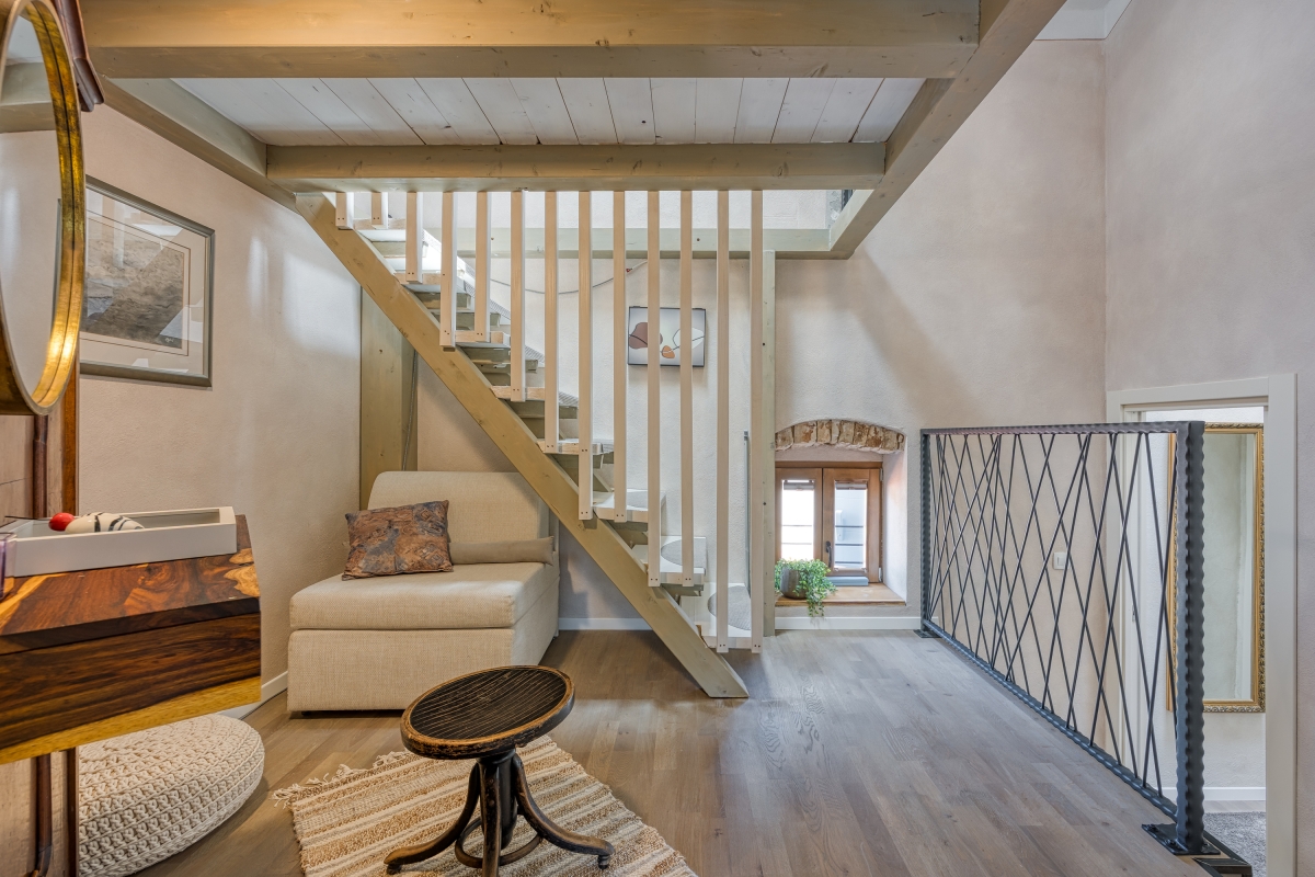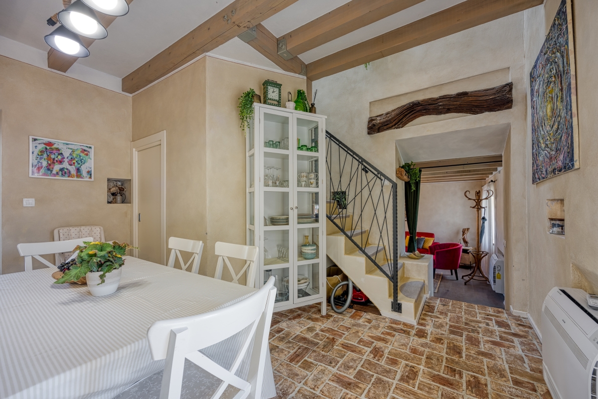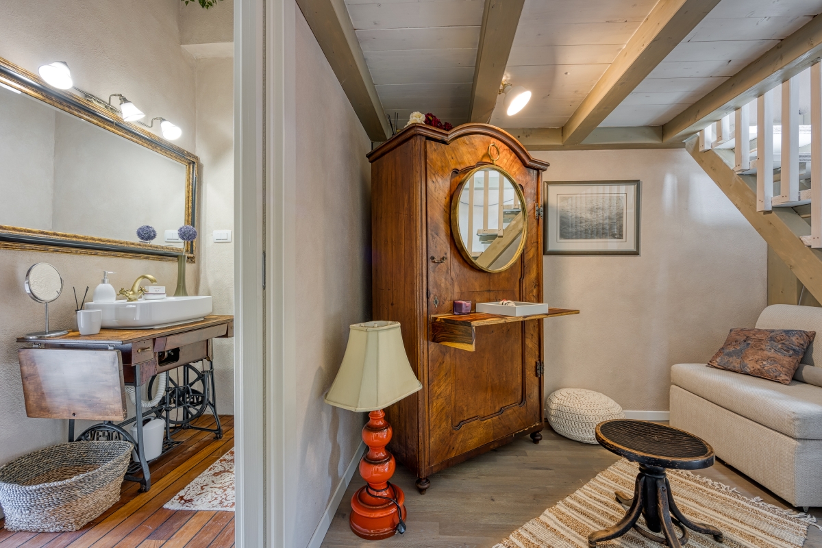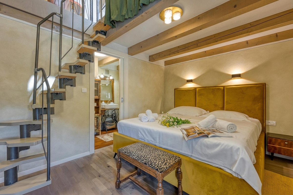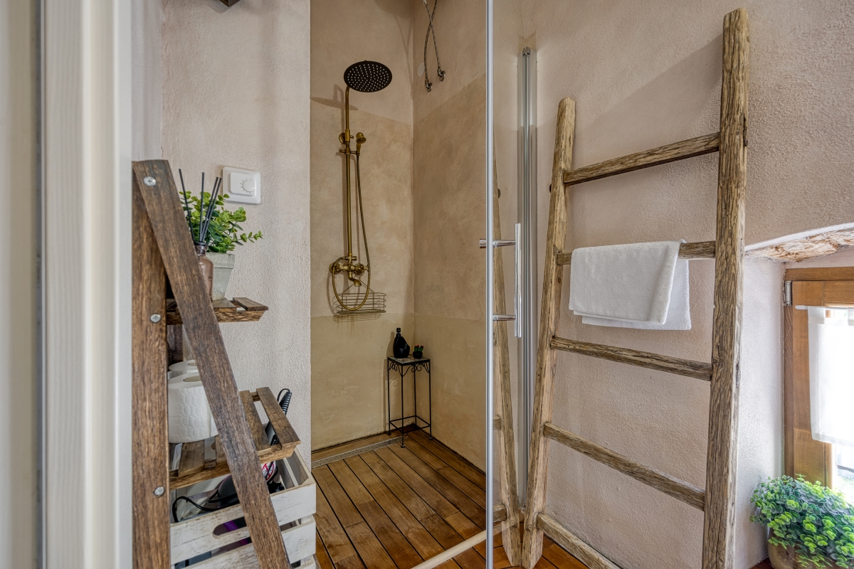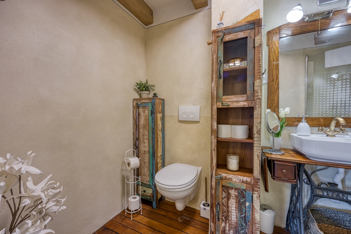 Inside, the living room is adorned with antique furnishings and an open wooden beam ceiling, creating a cosy atmosphere complemented by a flat-screen TV. A fully equipped kitchen is accessible from the living area and has a dining table with chairs. Essentials like a cooker hob, an electric kettle, an oven, a toaster, a dishwasher and a fridge with a freezer in the kitchen are at your disposal. There is a charming balcony accessible from the master bedroom, where you can enjoy your morning coffee with pleasing views. For remote workers, a laptop-friendly workspace is thoughtfully provided, ensuring productivity amidst tranquility.