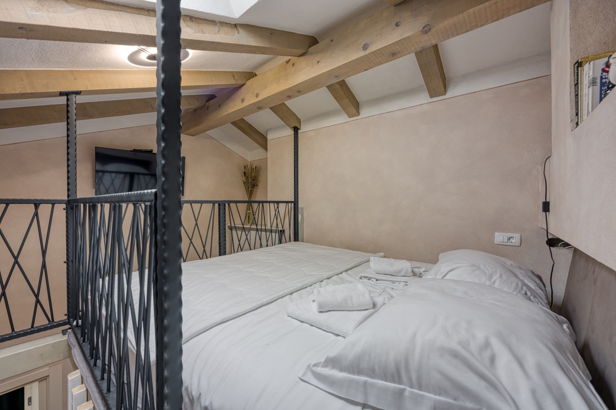 Bedroom 2: This is a gallery area that has a double bed on the floor and a flat-screen TV.
