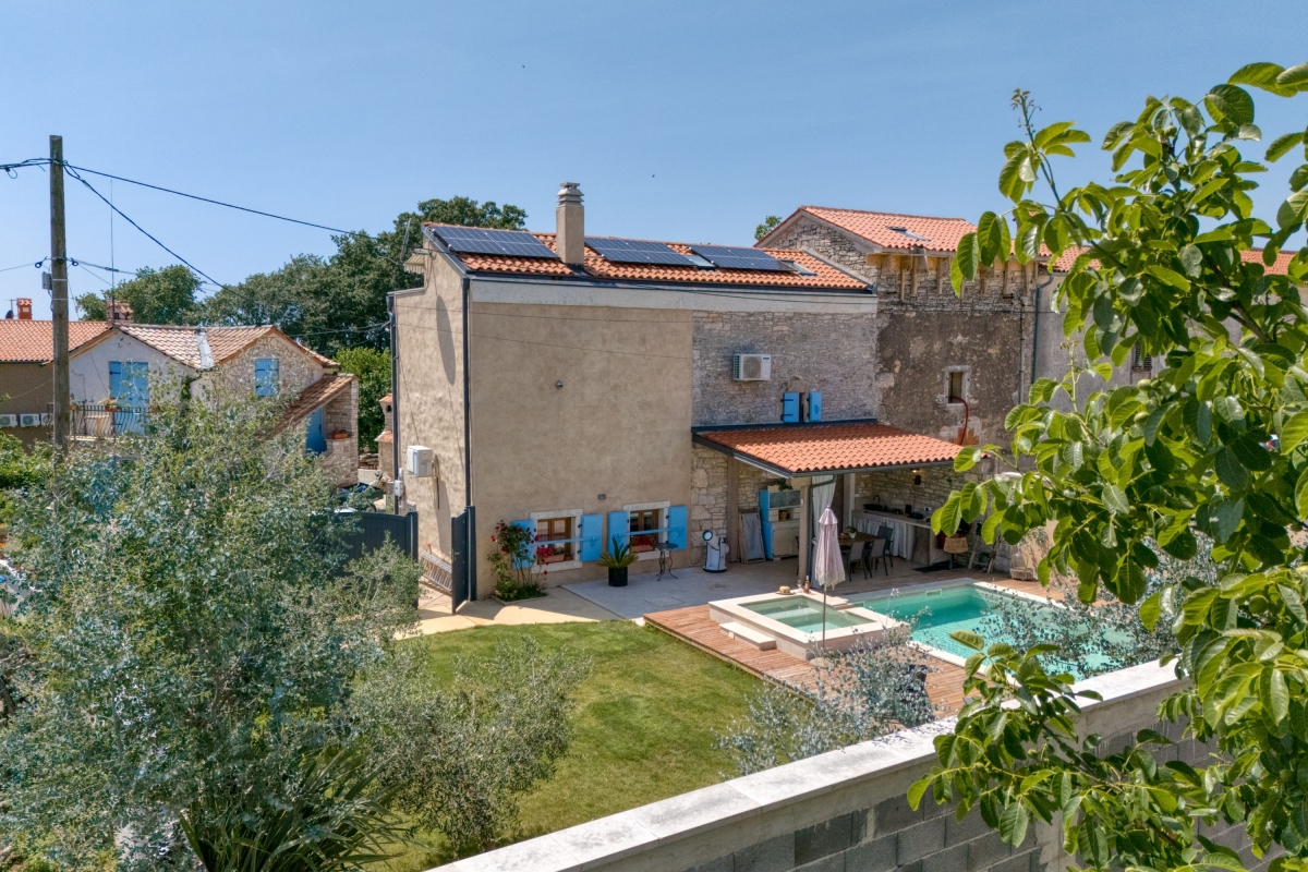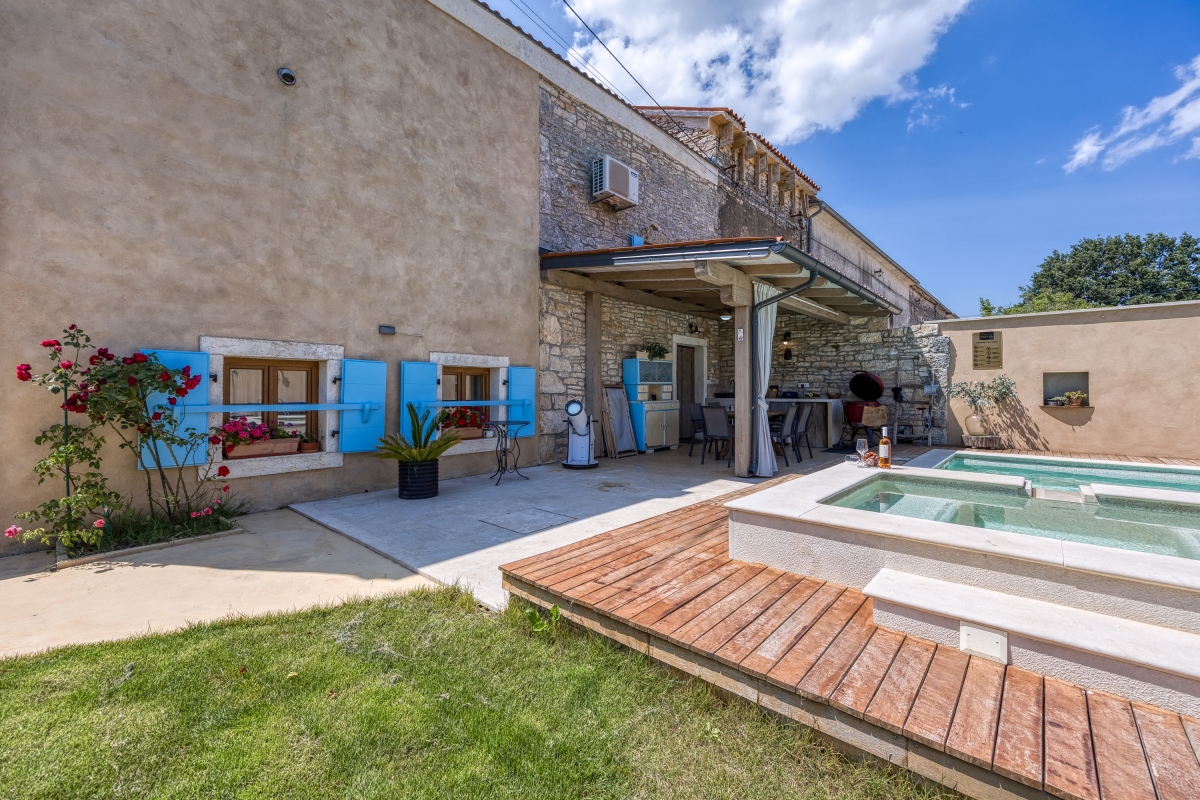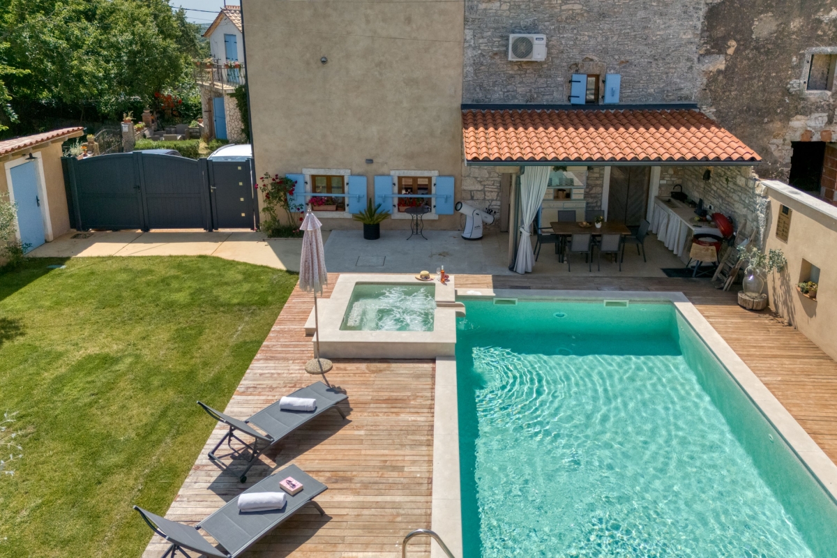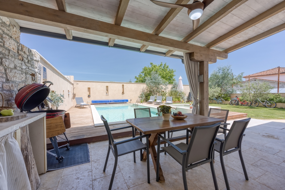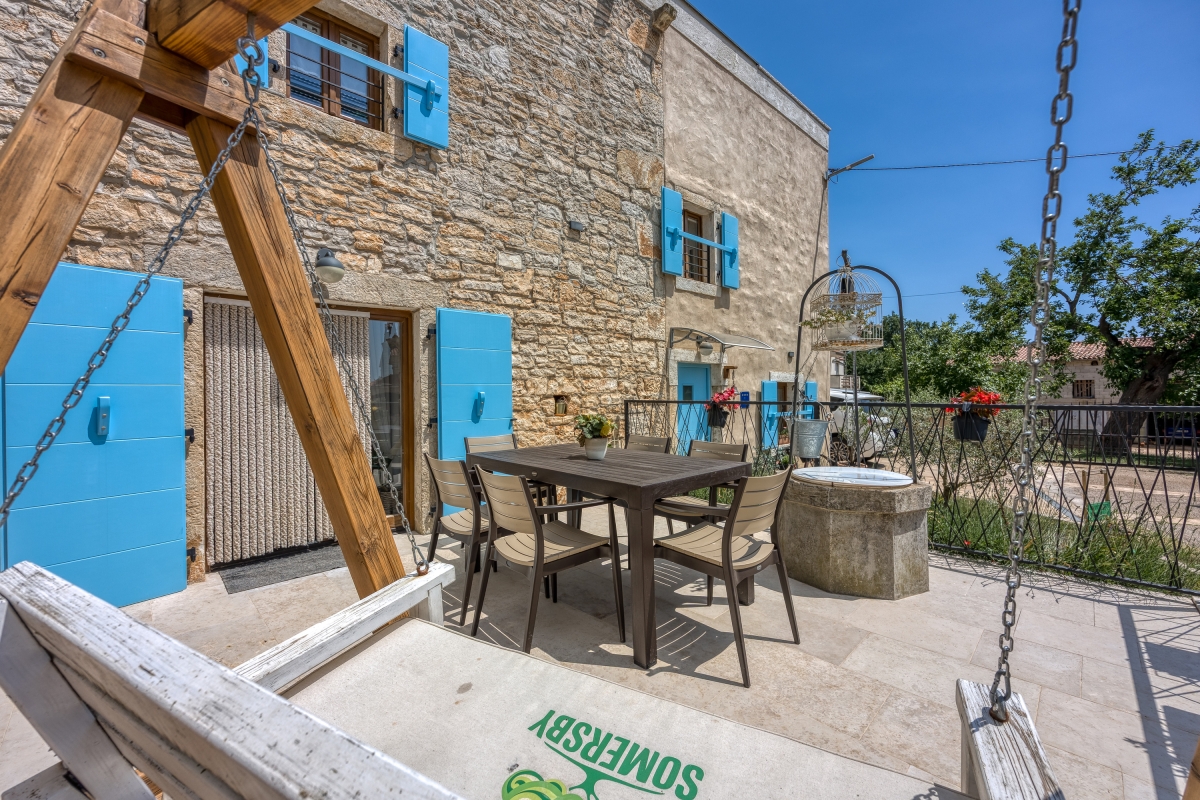 Situated in the serene beauty of Bibici, this exquisite home offers a luxurious retreat perfect for honeymoon couples and families with children. Spread across 2 elegantly designed floors, the 2-bedroom villa blends modern comfort with rustic charm, ideal for accommodating 6 guests. As you enter this striking holiday rental, you will be greeted by a porch swing on the terrace decorated with an old stone fountain. On the other side, a well-manicured private garden with a table Tennis set up, a private pool and sun loungers await your enjoyment and relaxation. A delightful outdoor kitchen with a charcoal grill and dining area by the pool enhances your alfresco dining experience.
