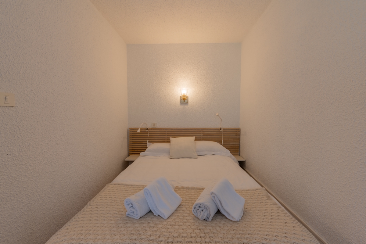 Bedroom: The bedroom opens onto the balcony and has a double bed, a single bed and a wardrobe.