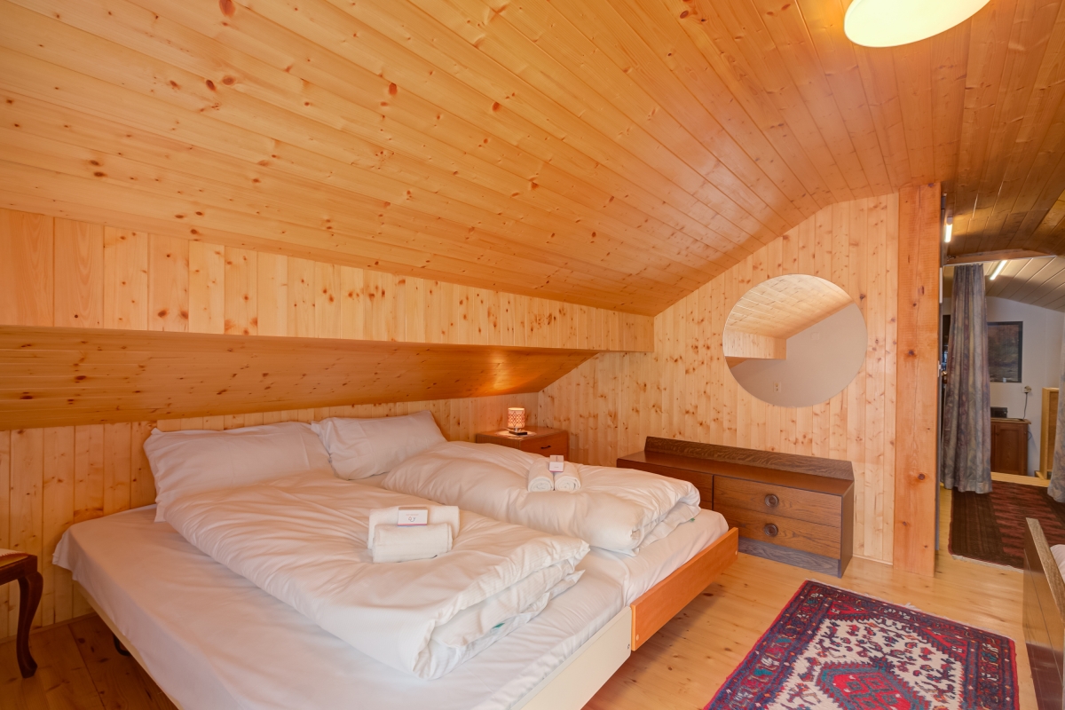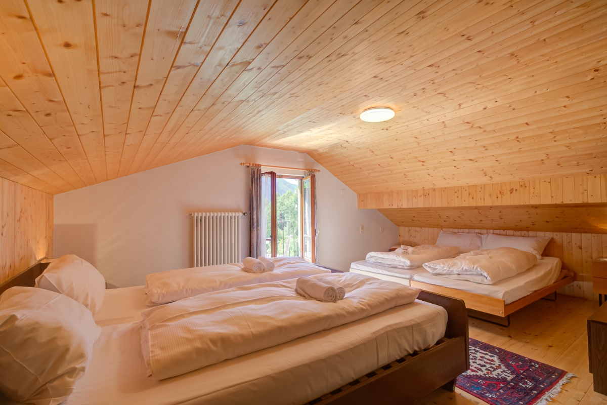 Tucked under the wooden roof, the cosy bedroom is furnished with two double beds and has a glass door that opens onto a balcony with stunning mountain views. There is a table and chairs where guests can sit with a cup of coffee and enjoy their surroundings.