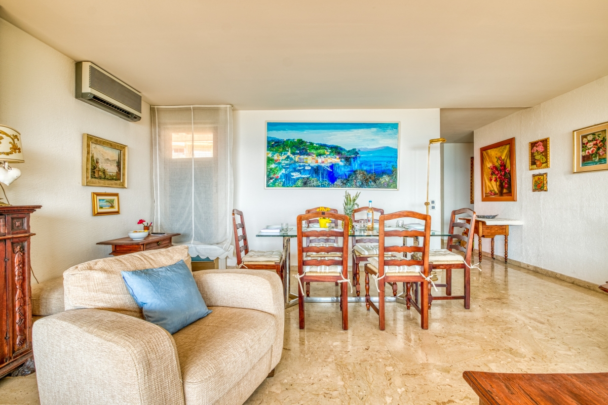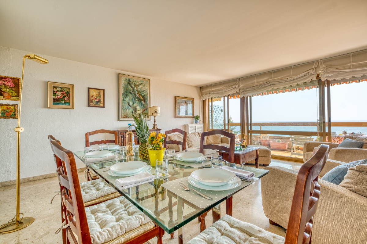 The front door goes into a hallway that leads into light-filled living room. The first thing that you will notice is the stunning view over the Mediterranean, thanks to the bank of windows and glass doors that open directly onto the terrace, which is an extension of the interior living space. The partly shaded terrace is furnished with a dining table, chairs and deck chairs so that guests can relax and enjoy the sea air.