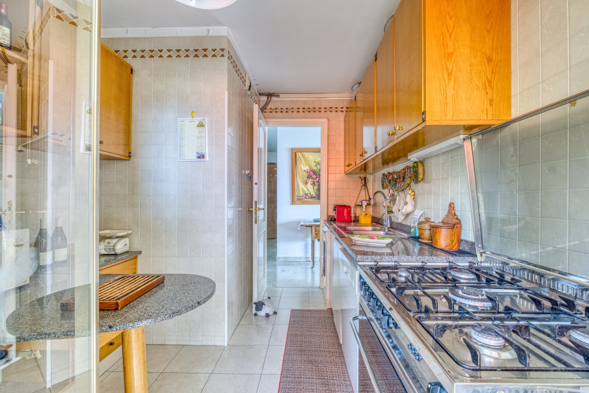 Back indoors, the living room is tastefully furnished with a contemporary sofa, armchairs, flat-screen TV and a dining table for 6. The separate kitchen is off the hallway and well-equipped with a large cooker hob, oven, microwave, dishwasher, coffee machine, washing machine and fridge. A back door leads out to a separate balcony which overlooks the hills.