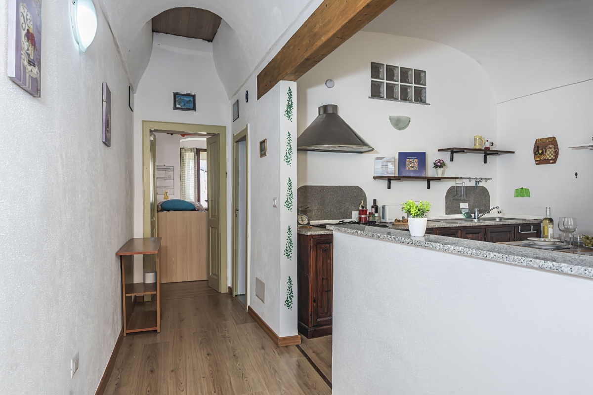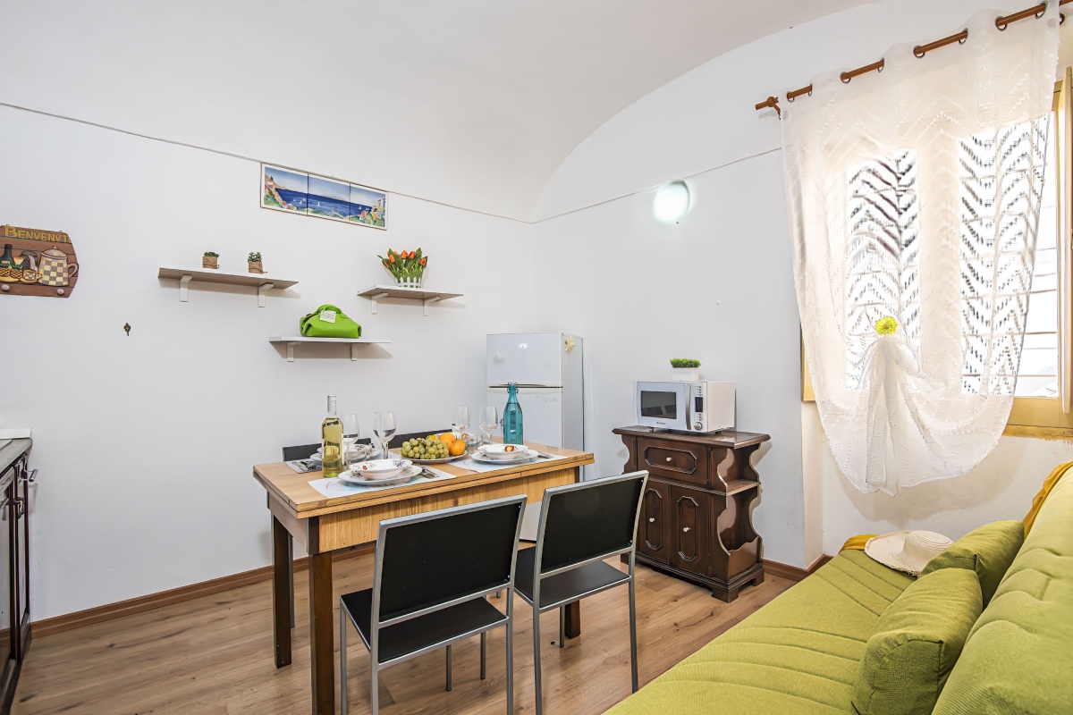 The simple interior consists of an open-plan living space at the front of the house. This is furnished with a sofa, a dining table with chairs and and fitted kitchen. The kitchen is equipped with a cooker hob, microwave, Mokka coffee maker and fridge/freezer.