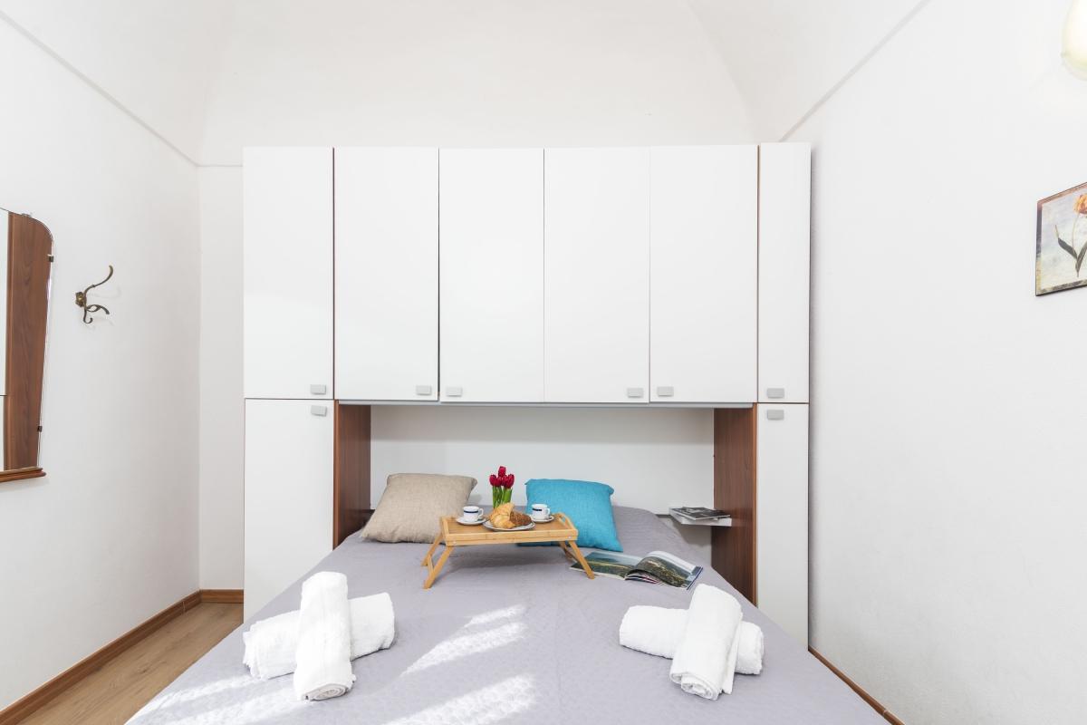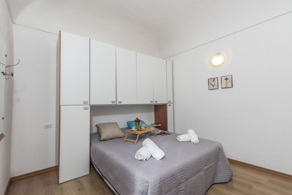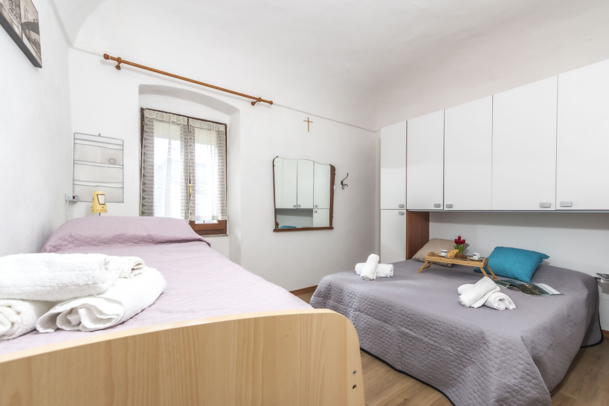 The bedroom has a double bed, with a bunk bed and a wardrobe