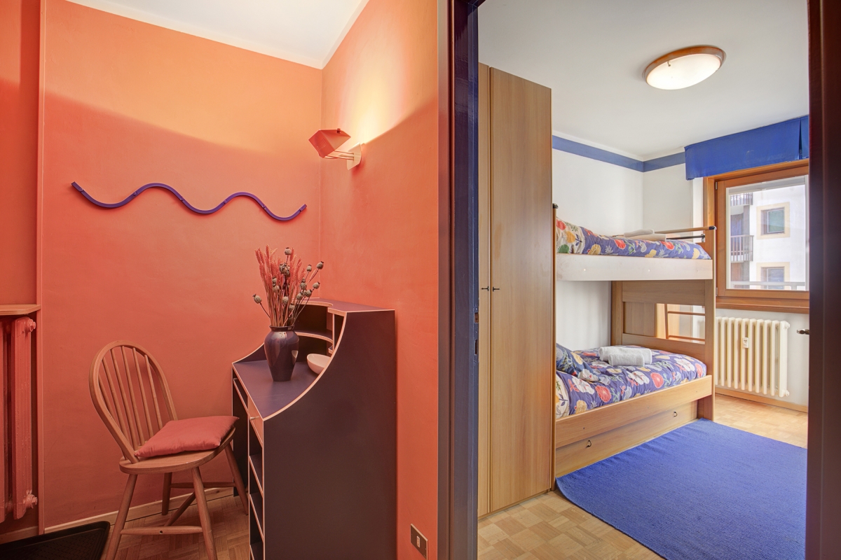 Bedroom 2: The second bedroom also has a bunk bed , a wardrobe and a glass door leading out onto the balcony.