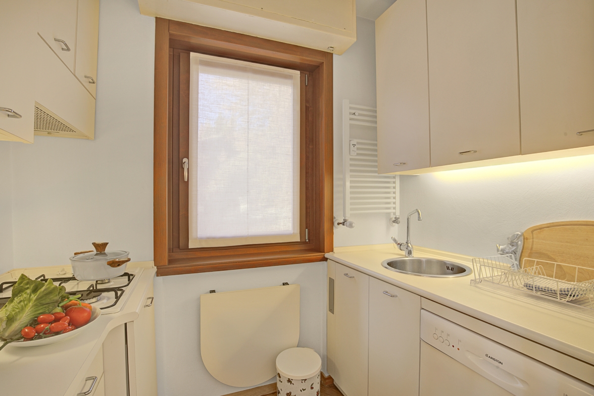 On the ground floor, the colourful apartment has a cosy open-plan living area, with a comfortable sofa, smart TV and a round dining table. A glass door leads out onto a private balcony, where guests can enjoy the mountain landscape. The separate kitchenette, off the living room, is equipped with a cooker hob, oven, fridge and dishwasher.