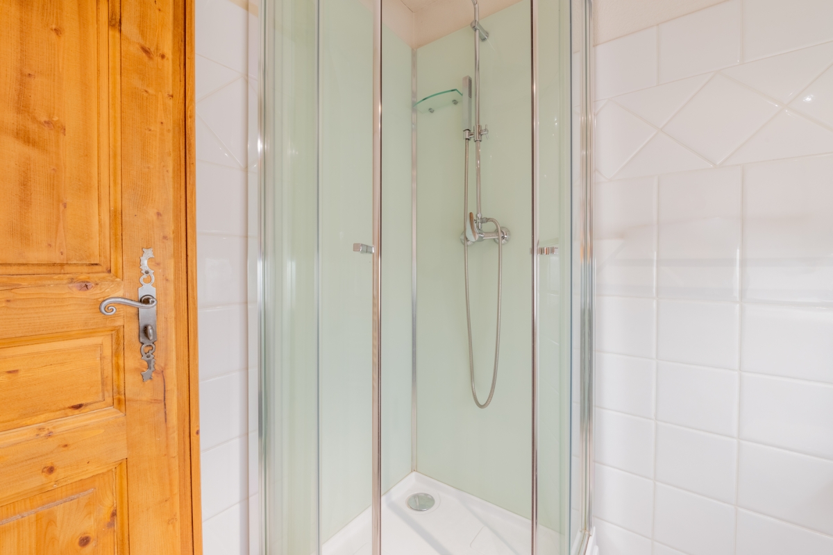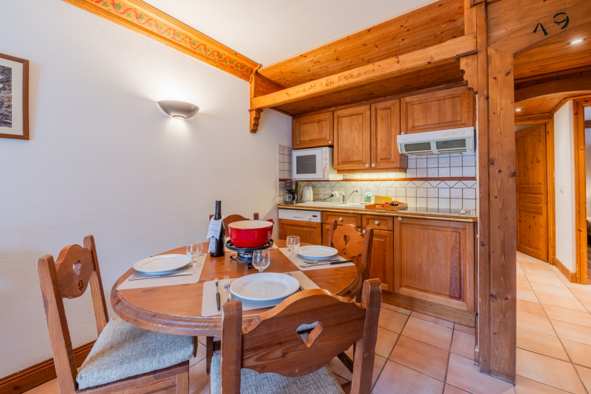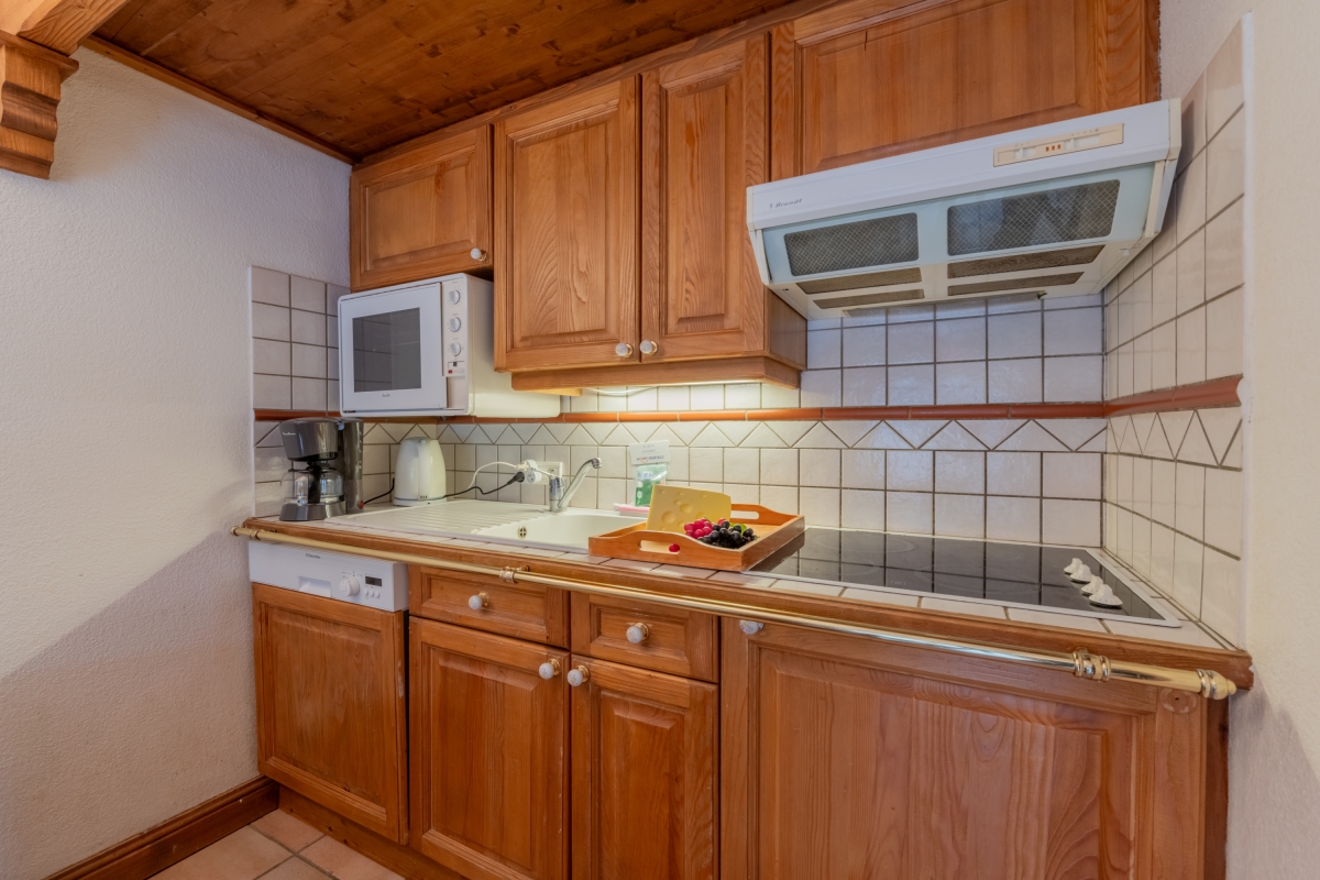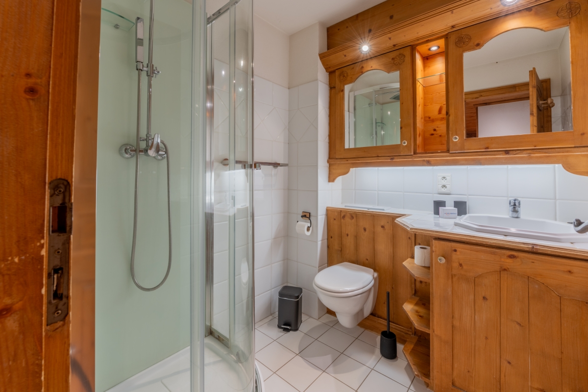 The apartment is on the 1st floor (with lift) of an attractive development. The decor is cosy, with alpine touches and wooden features and furniture. The entrance hallway opens onto a spacious living area. The room is furnished with a sofa, armchair, flat-screen TV and a dining table and chairs for 4. Next to the dining table is the kitchenette which is well-equipped with a cooker hob, oven, microwave, dishwasher, fridge and coffee machine. At the other end of the room glass doors lead out onto a private balcony. This is furnished with tables and chairs so that guests can enjoy the mountain views with a cup of coffee or a glass of wine.