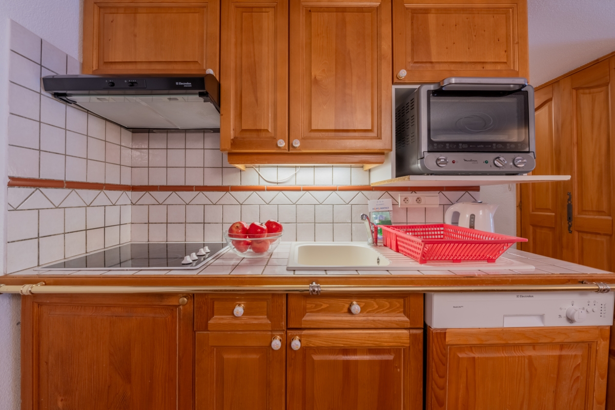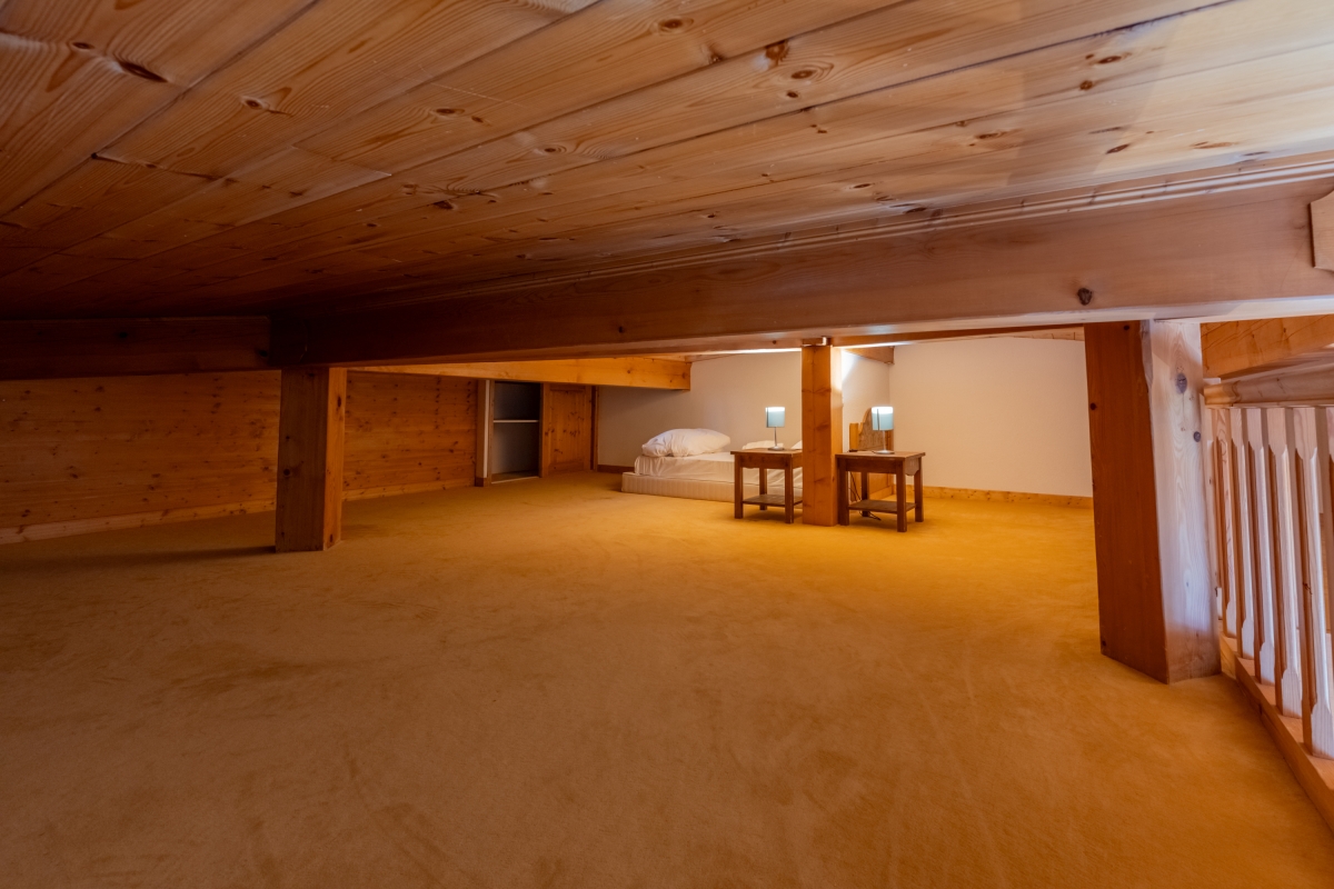 The apartment is on the 3rd floor (with lift), and is tastefully decorated with attractive wooden furniture throughout. The open-plan living space has a large glass door that leads out to a private balcony. The balcony is furnished with a table and chairs so that guests can enjoy the stunning mountain views with a cup of coffee or a glass of wine. Back inside, the seating area has a sofa and armchair with a flat-screen TV. Steep stairs lead up to the mezzanine. The kitchen/diner is towards the rear of the room. The dining table for 6 people is next to the kitchen which has fitted wooden units. The kitchen is well-equipped with an induction hob, oven, microwave, dishwasher, fridge/freezer and drip coffee machine.