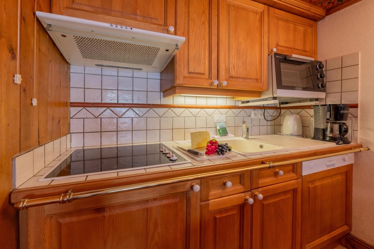 On the 3rd floor (with lift), the private balcony enjoys panoramic views of the forest and mountains. A table and chairs allow guests to have a cup of coffee or glass of wine al fresco. Inside, the apartment has lovely wooden features and tiled floors. The seating area, which leads out to the balcony, is furnished with a sofa, armchair and a flat-screen TV. The charming kitchen/diner is towards the rear of the room. The dining table for 4 people and fitted wooden units. The kitchen is well-equipped with a cooker hob, oven, microwave, dishwasher, fridge/freezer and drip coffee machine.