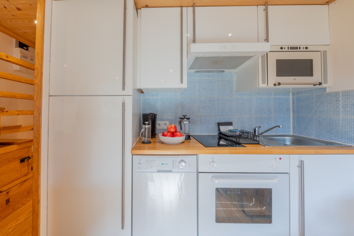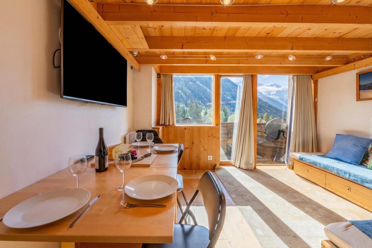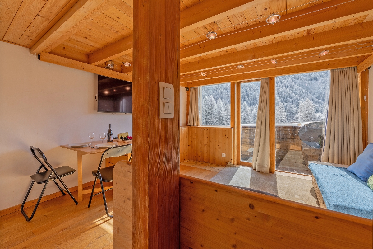 On the third floor (with lift), the apartment is tastefully decorated with an alpine feel with a contemporary twist. The open-plan living room is flooded with sunlight thanks to large glass doors that open onto a private balcony. The balcony offers panoramic mountain views. Back indoors in the seating area, there is an L-shaped sofa and a Smart TV. Next to this is the dining area, with a wooden table that seats 4. The kitchen is at the rear of the living area and is equipped with a cooker and induction hob, microwave, fridge and coffee machine.