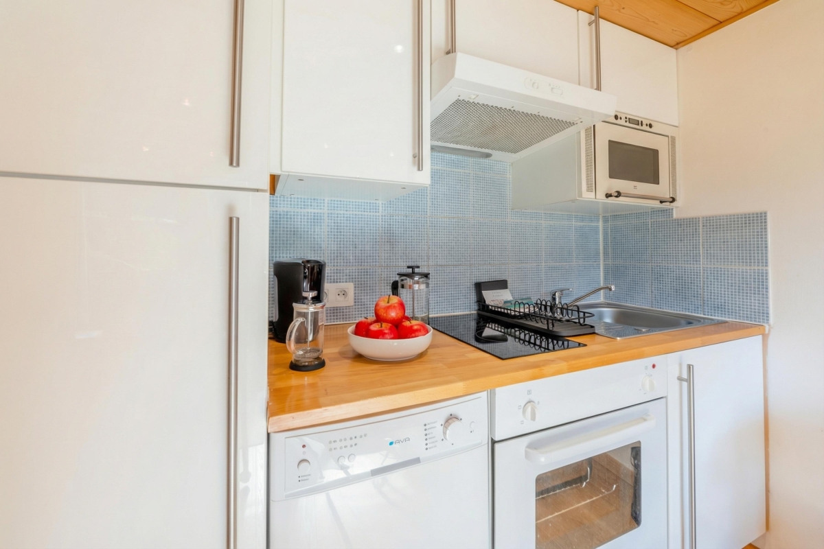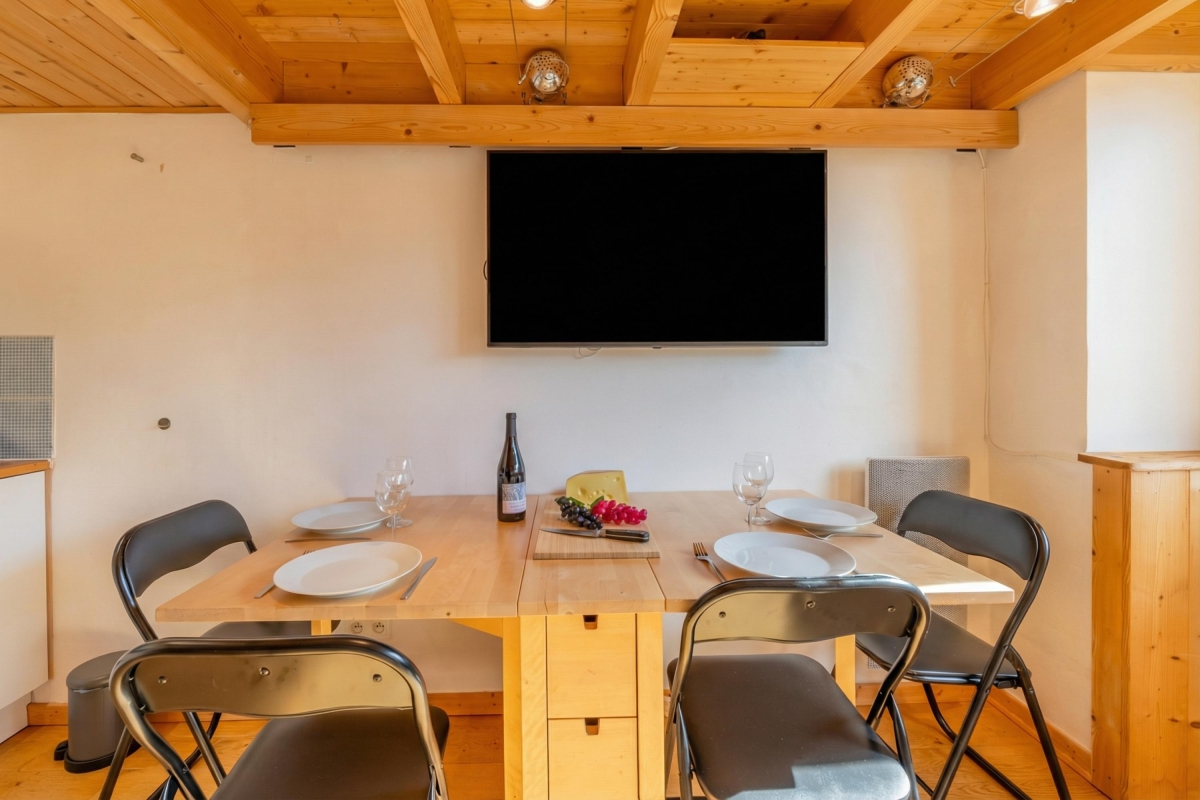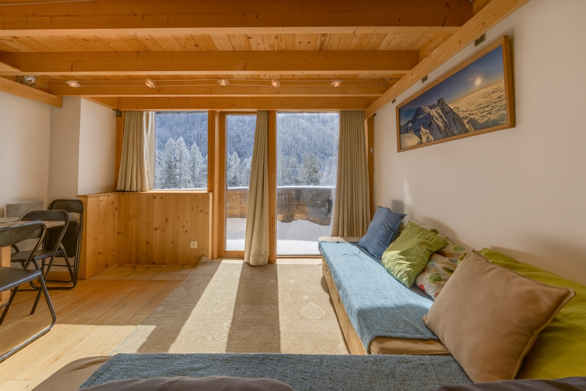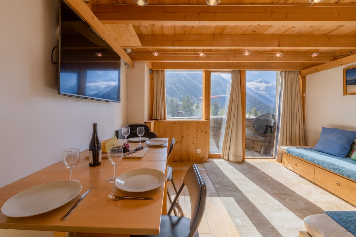 On the third floor (with lift), the apartment is tastefully decorated with an alpine feel with a contemporary twist. The open-plan living room is flooded with sunlight thanks to large glass doors that open onto a private balcony. The balcony offers panoramic mountain views. Back indoors in the seating area, there is an L-shaped sofa and a Smart TV. Next to this is the dining area, with a wooden table that seats 4. The kitchen is at the rear of the living area and is equipped with a cooker and induction hob, microwave, fridge and coffee machine.