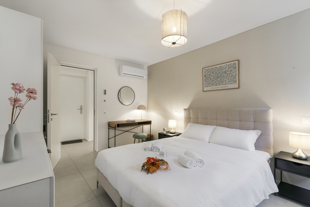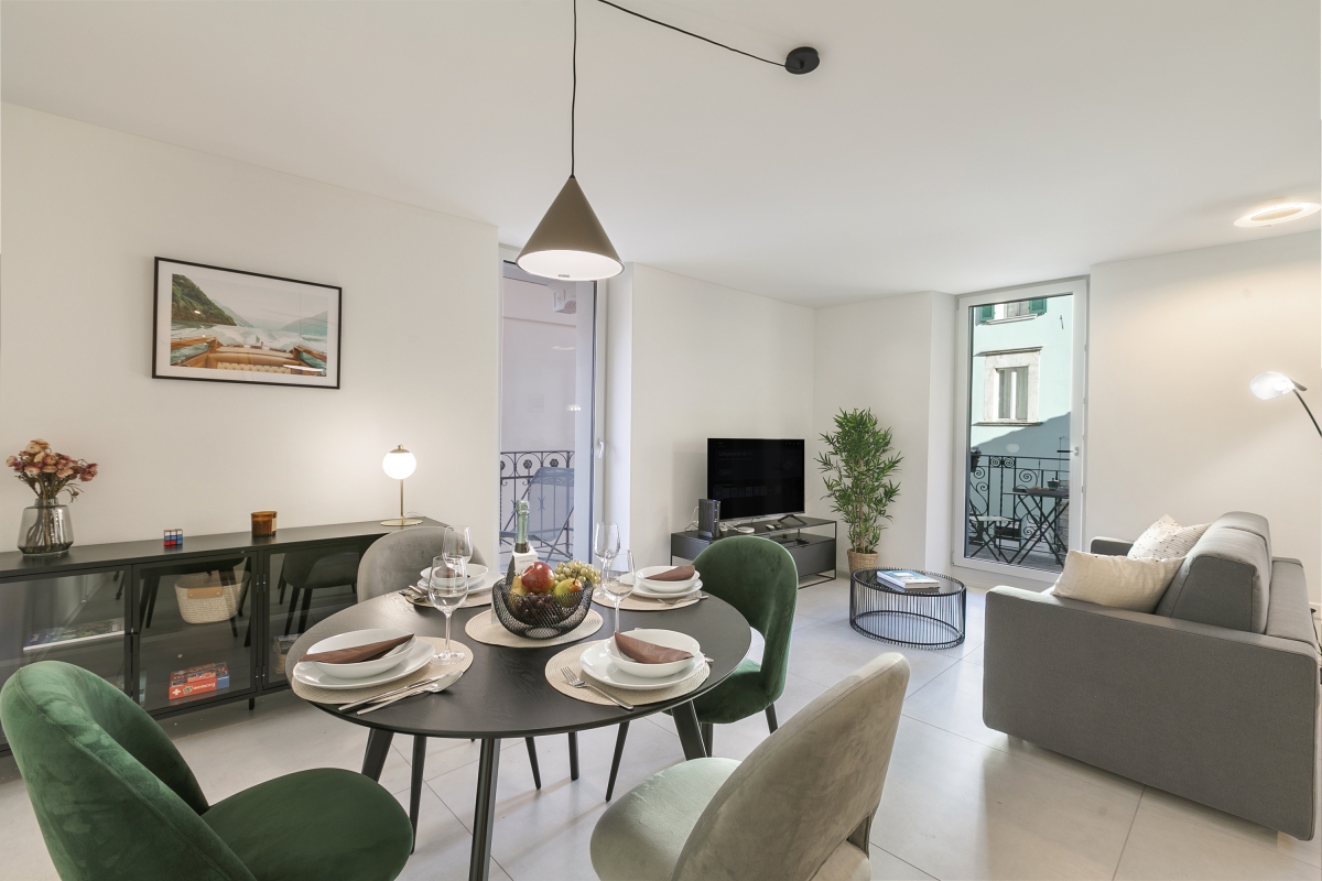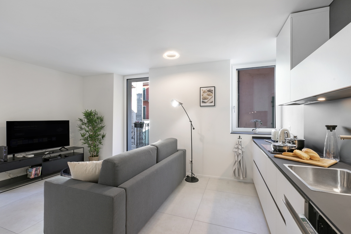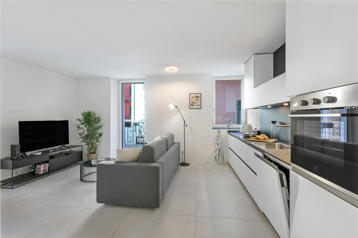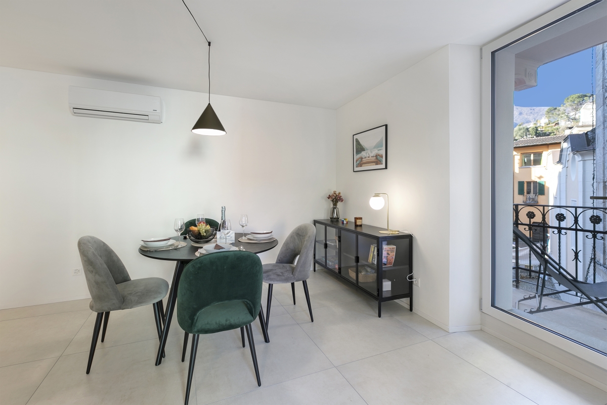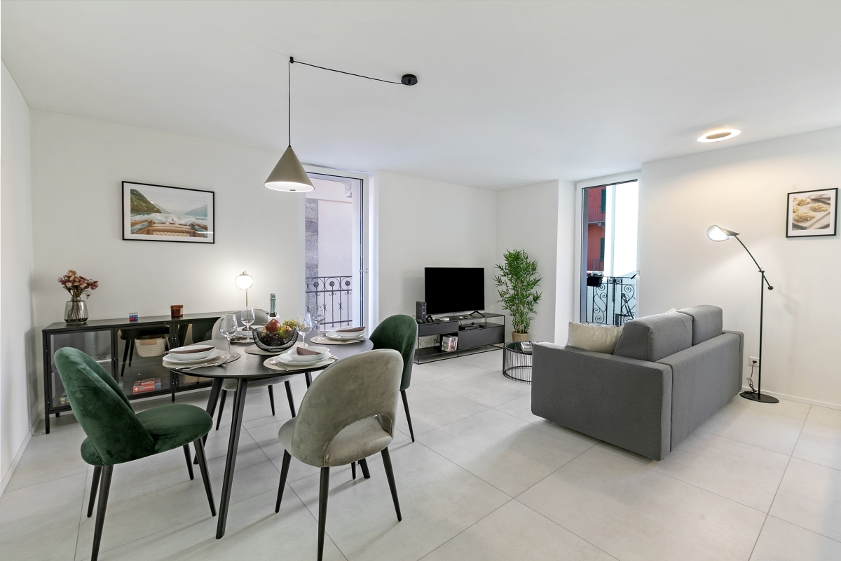 This stylish apartment accommodates up to 4 guests and is on the second floor of a modern four-story building. Accessed through a historic courtyard this charming, dual-aspect escape features two sunny balconies with views of the cobbled streets and lake shore.