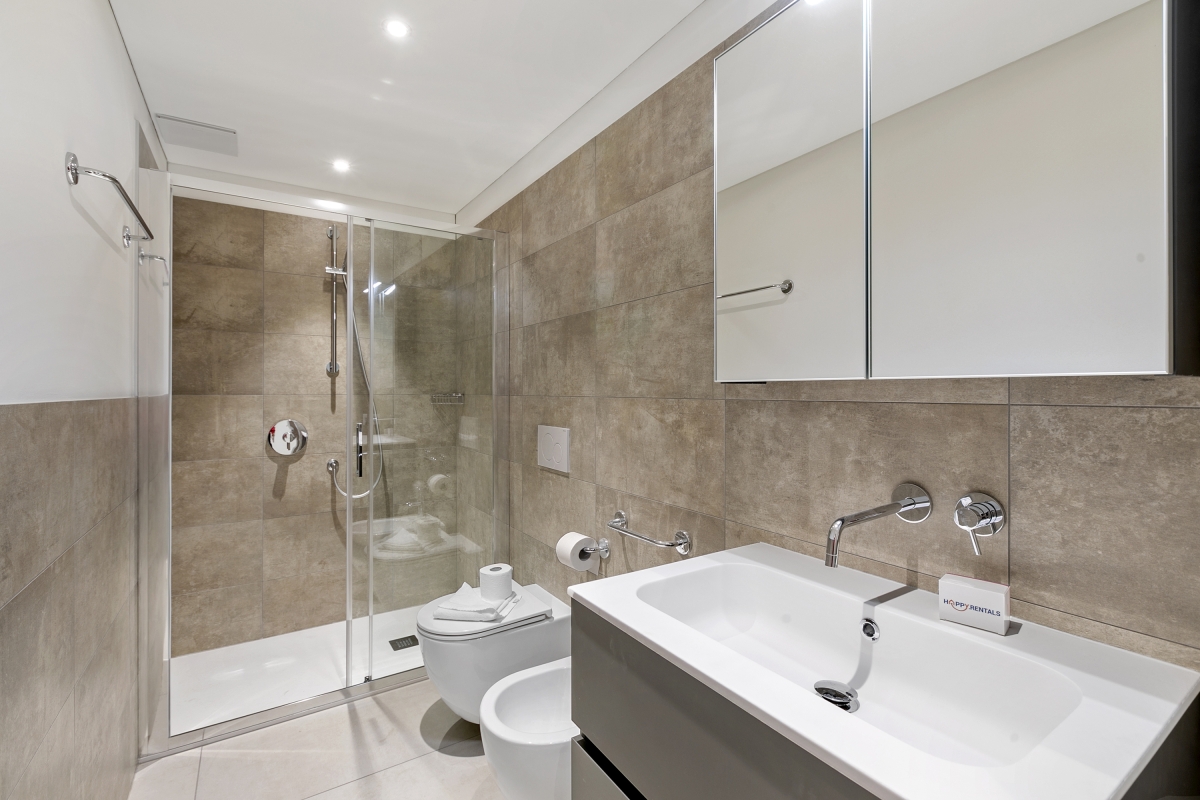 The modern bathroom is fitted with a spacious shower, a washbasin, a bidet and a WC