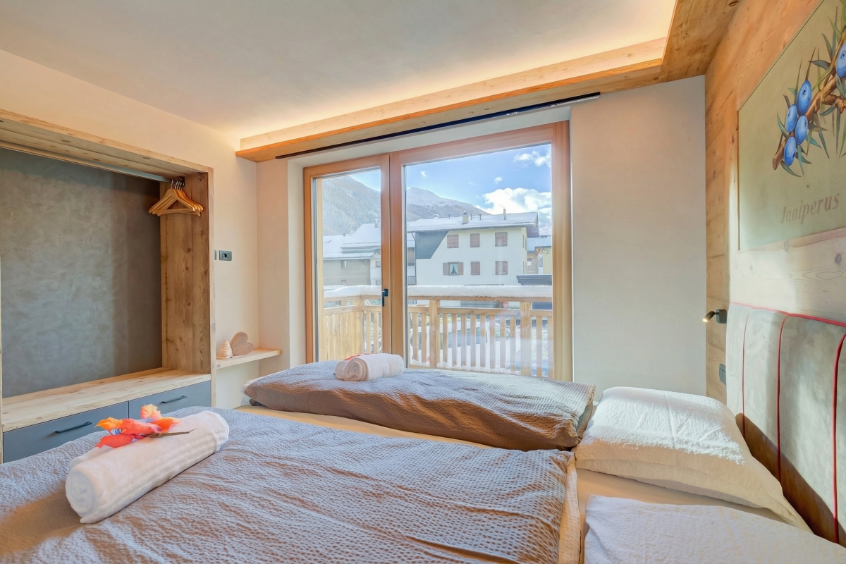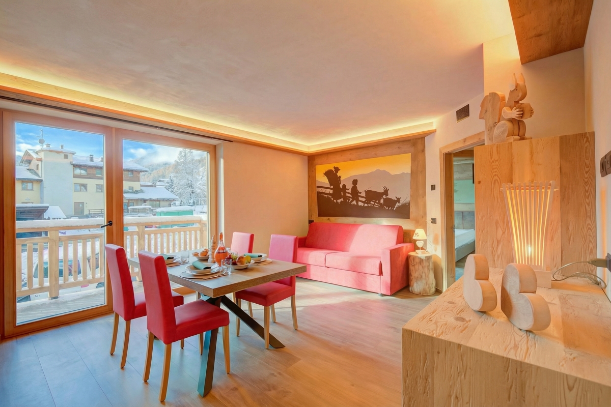 The apartment is towards the southern edge of Livigno close to shops and a range of restaurants to suit all tastes. It is a peaceful spot but with great access to the ski slopes, where guests can ski in and out.