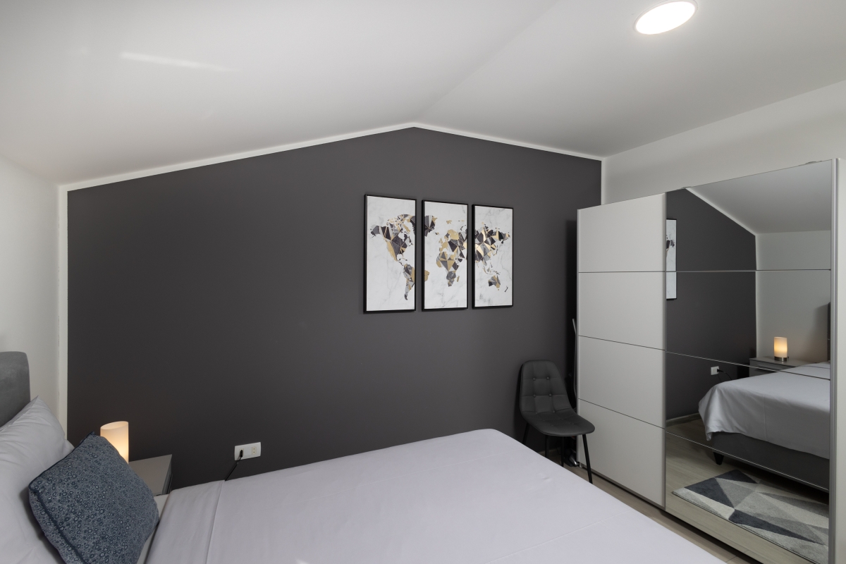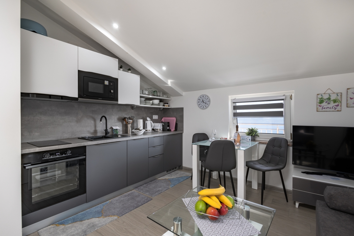 The sea-view apartment features a bright and spacious living area that is thoughtfully furnished with a contemporary touch, providing a relaxing and inviting atmosphere. One of the apartment’s highlights is the large terrace with a BBQ, where you can soak in the spectacular sea views and savour outdoor meals. The terrace is the ideal spot to start your morning with a cup of coffee while watching the sunrise over the Adriatic or to spend evenings grilling fresh local delicacies and enjoying a glass of wine as the sun sets on the horizon.