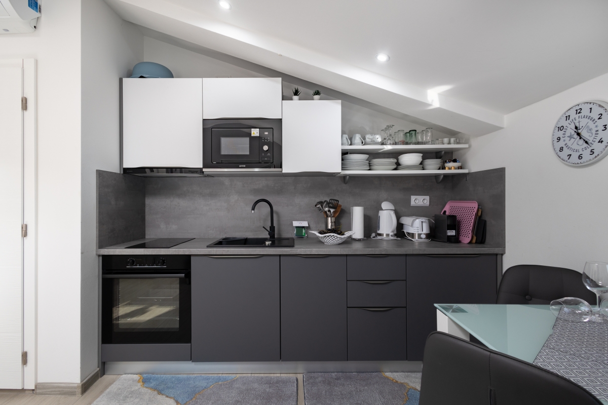 The apartment has everything needed for a comfortable stay: a modern open kitchen with essential appliances, and air conditioning for year-round comfort.