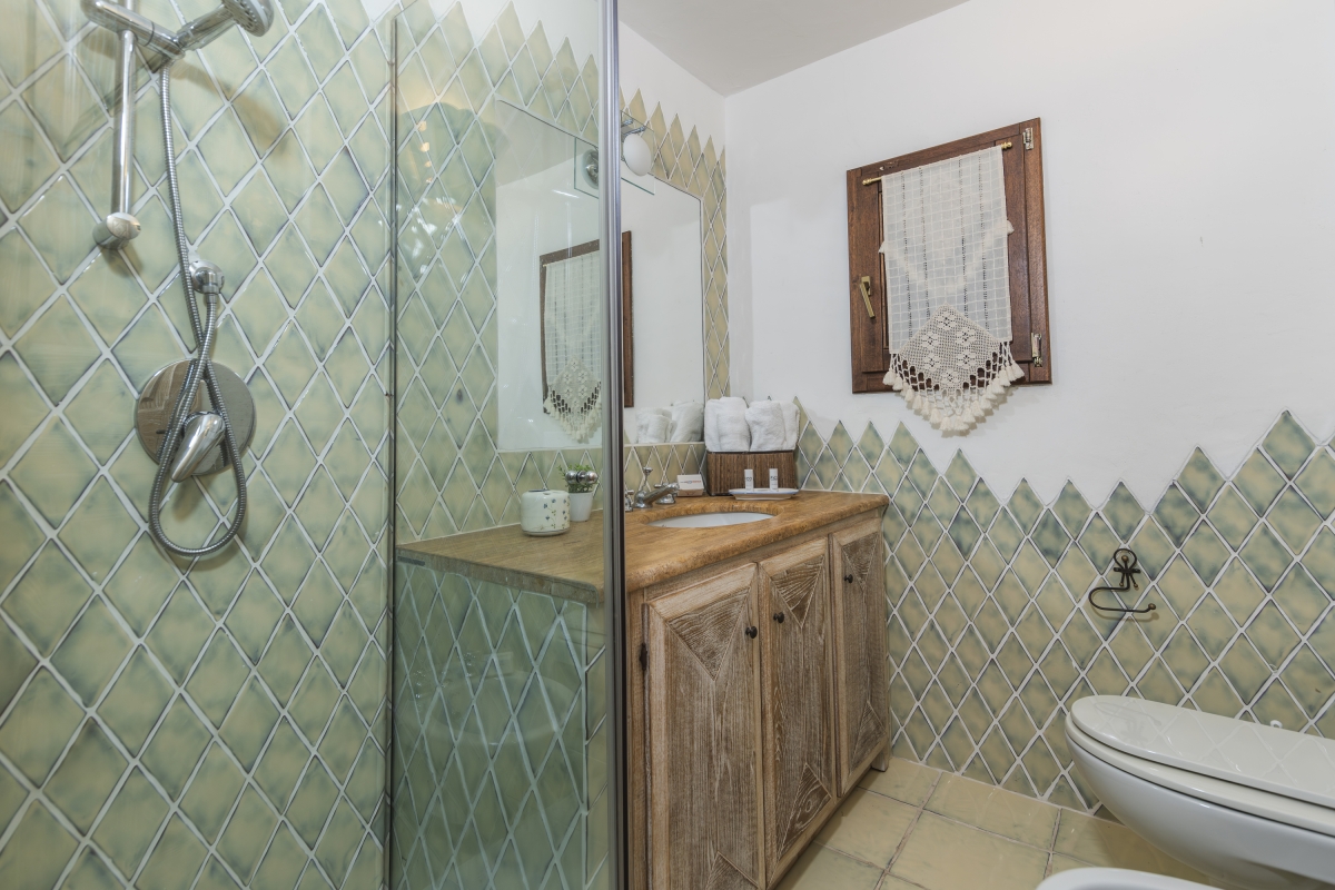 Inside the villa, there is a spacious open-plan living area, furnished with three beautiful sofas and an antique dining table. Large glass doors open onto the veranda and offer magnificent sea views. For guests who need to work whilst they’re on holiday, there is a separate office with a desk and yet another stunning view of the coast. The stylish kitchen is well-equipped with a cooker hob, oven, microwave, dishwasher, Moka coffee maker and an American fridge/freezer.