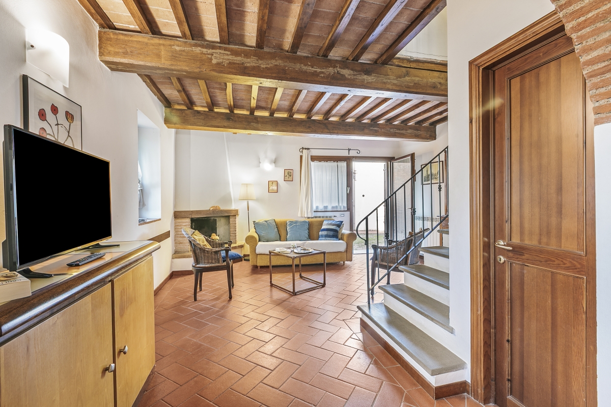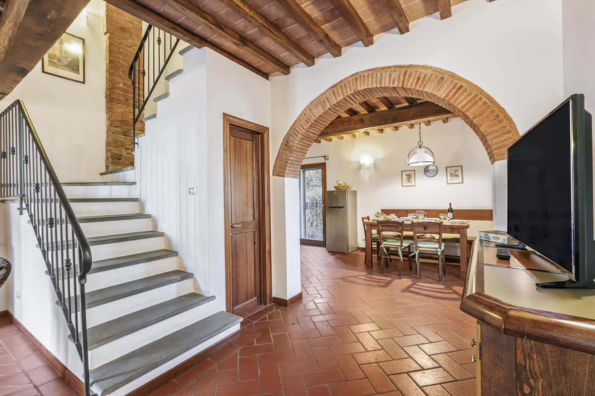 The bright and spacious Fienile apartment is arranged over the ground and first floors of a converted barn (the neighbouring unit is ID 1727 Olivio) and is accessed via a private entrance. Inside, the property enjoys an open-plan living room furnished with a sofa bed, a fireplace and a flat-screen satellite TV. It also incorporates a dining area and a kitchen fitted with a coffee machine, a gas cooker hob, a microwave, a dishwasher and a fridge freezer.