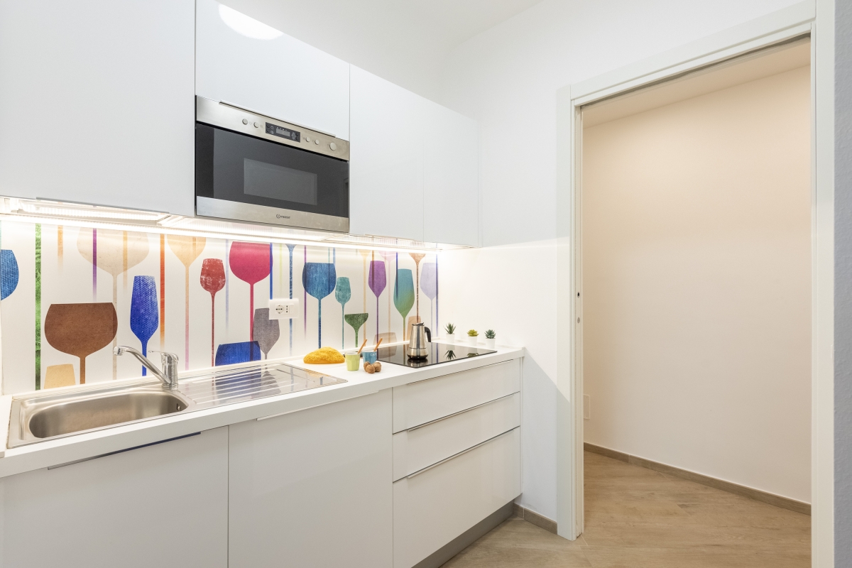 The apartment has a chic interior with a spacious layout, the open living room has a sofa, TV and dining area. There is a fully equipped kitchen with a coffee machine, microwave, oven, fridge, and induction hob, making it perfect for preparing meals at home.